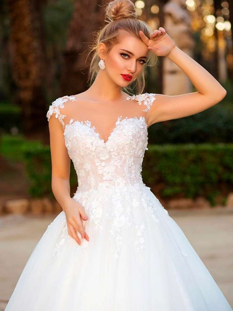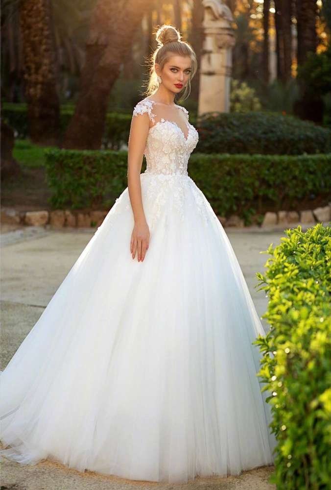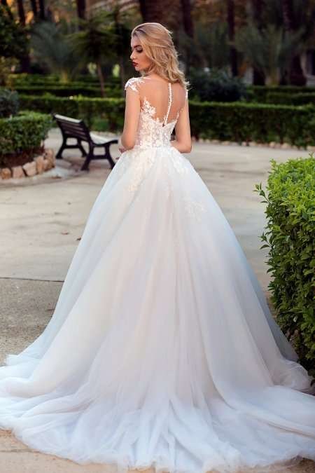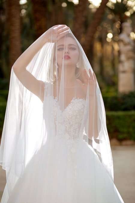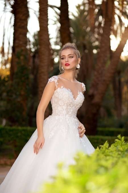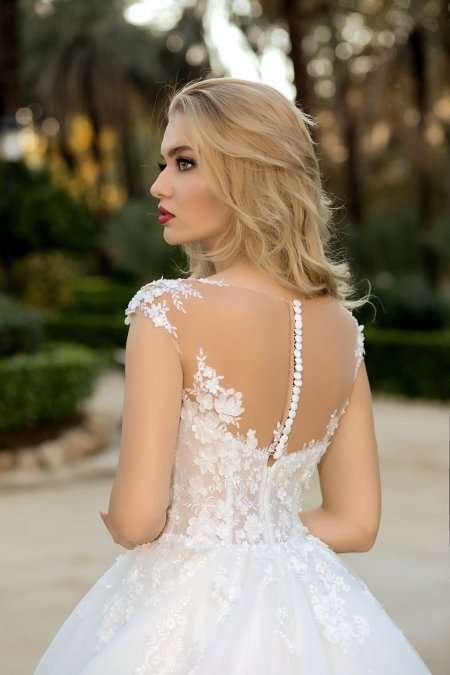 El vestido está hecho de tul y satén. Cuenta hermosos apliques de encaje y flores en 3D, con pedrería que adorna el vestido resaltando la belleza del vestido. Un vestido de novia romántico y de ensueño, perfecto para todas las novias en el gran día.