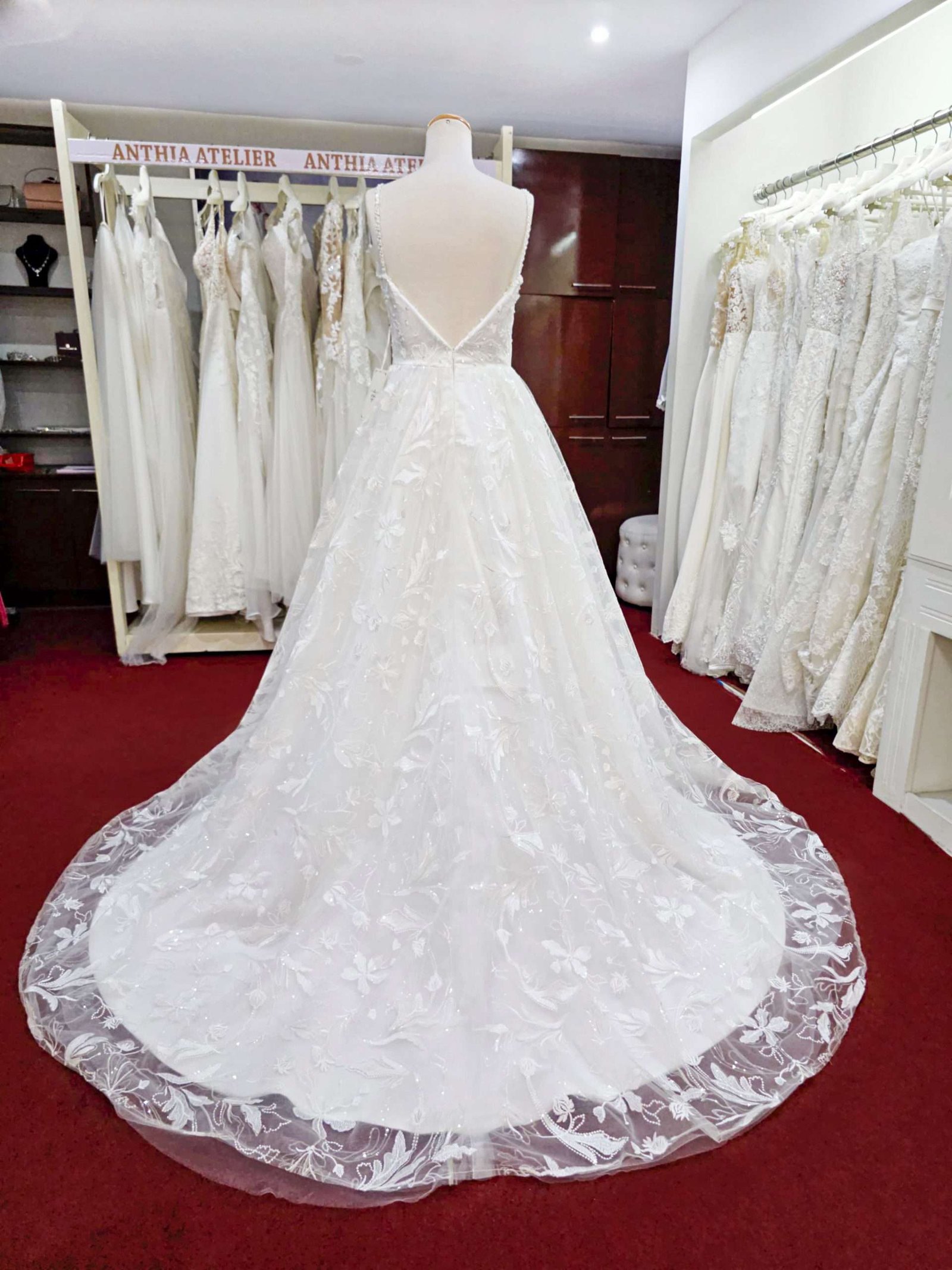 Vestido de boda con tirantes finos, con escote en V profundo.