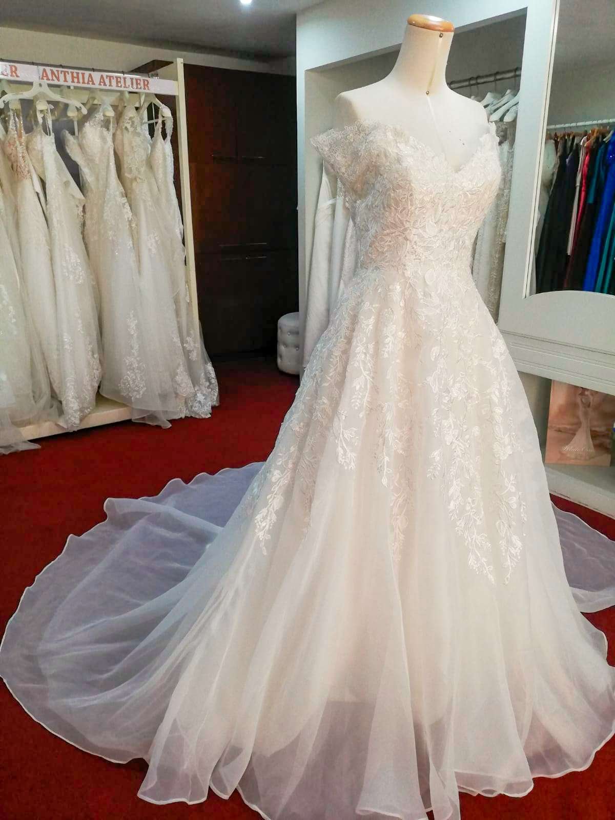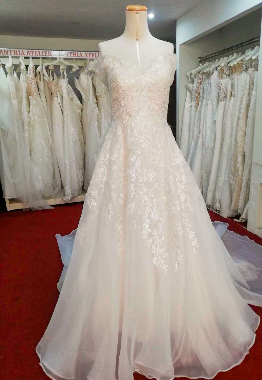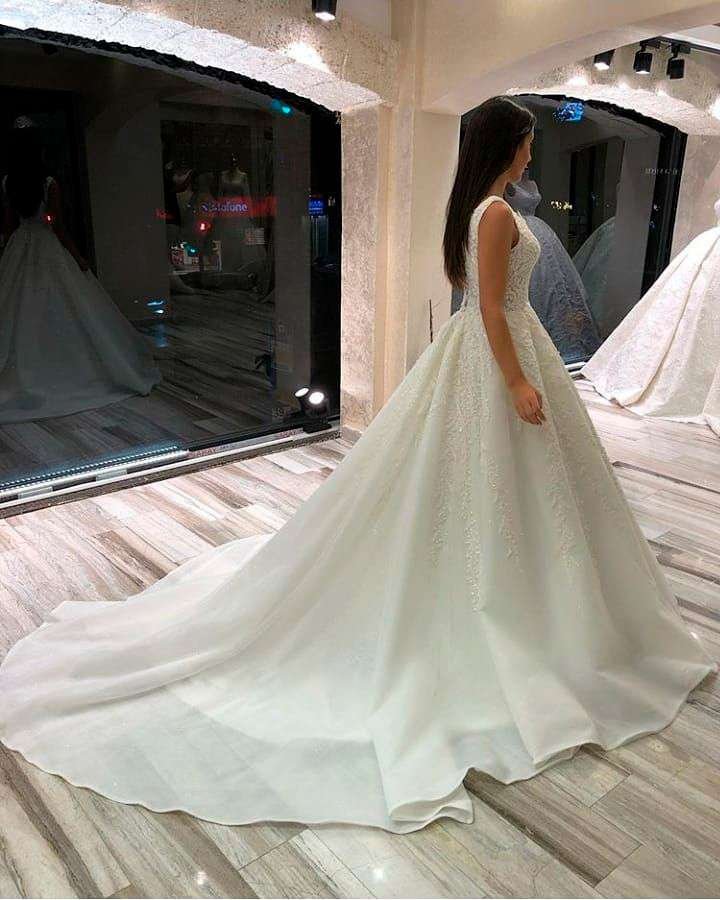 Hermoso modelo corte en A, sin mangas, escote en V y apliques de encaje.