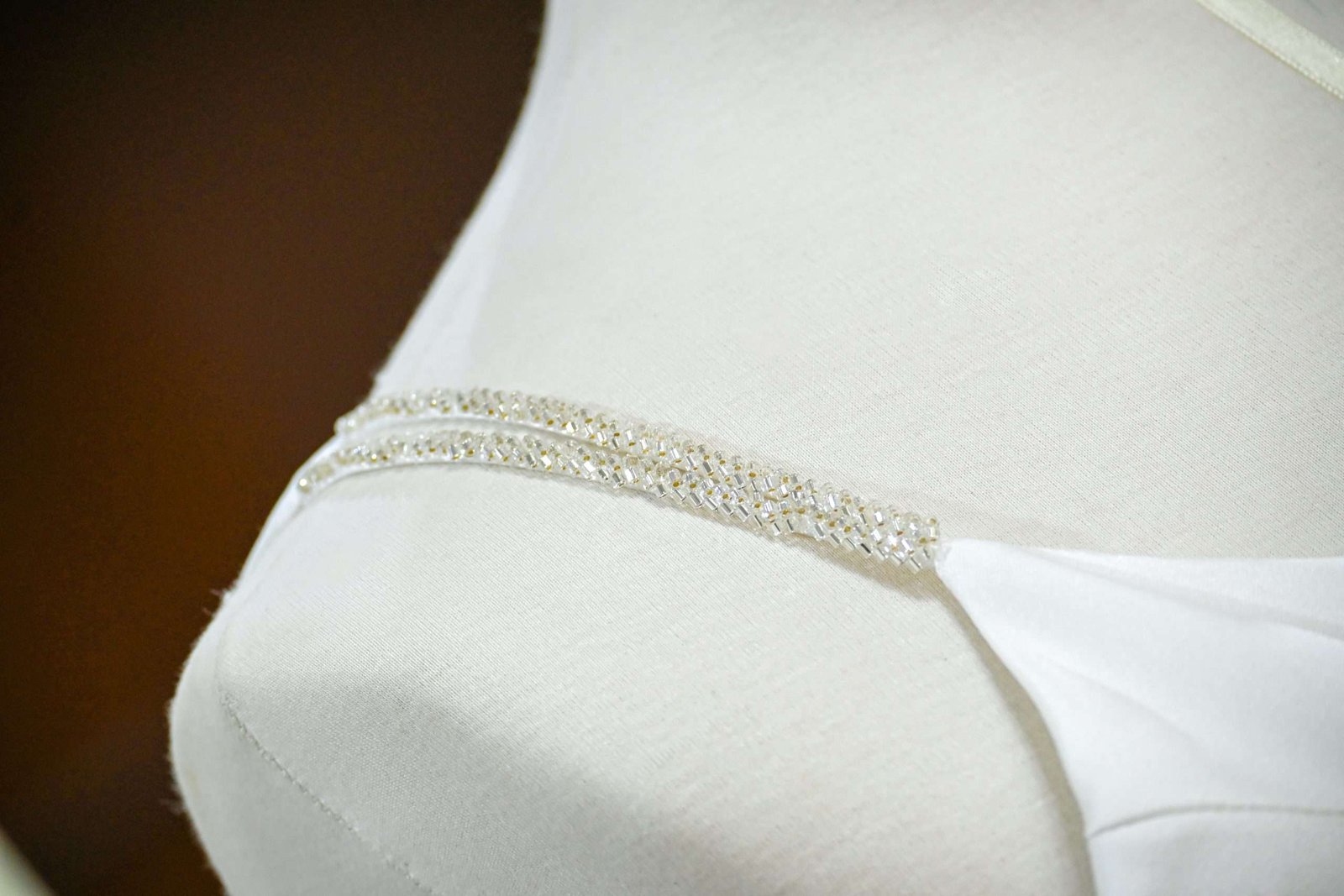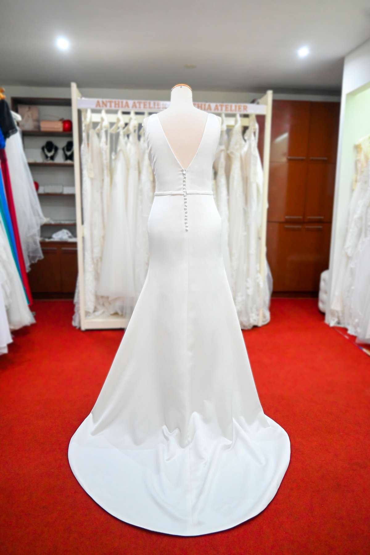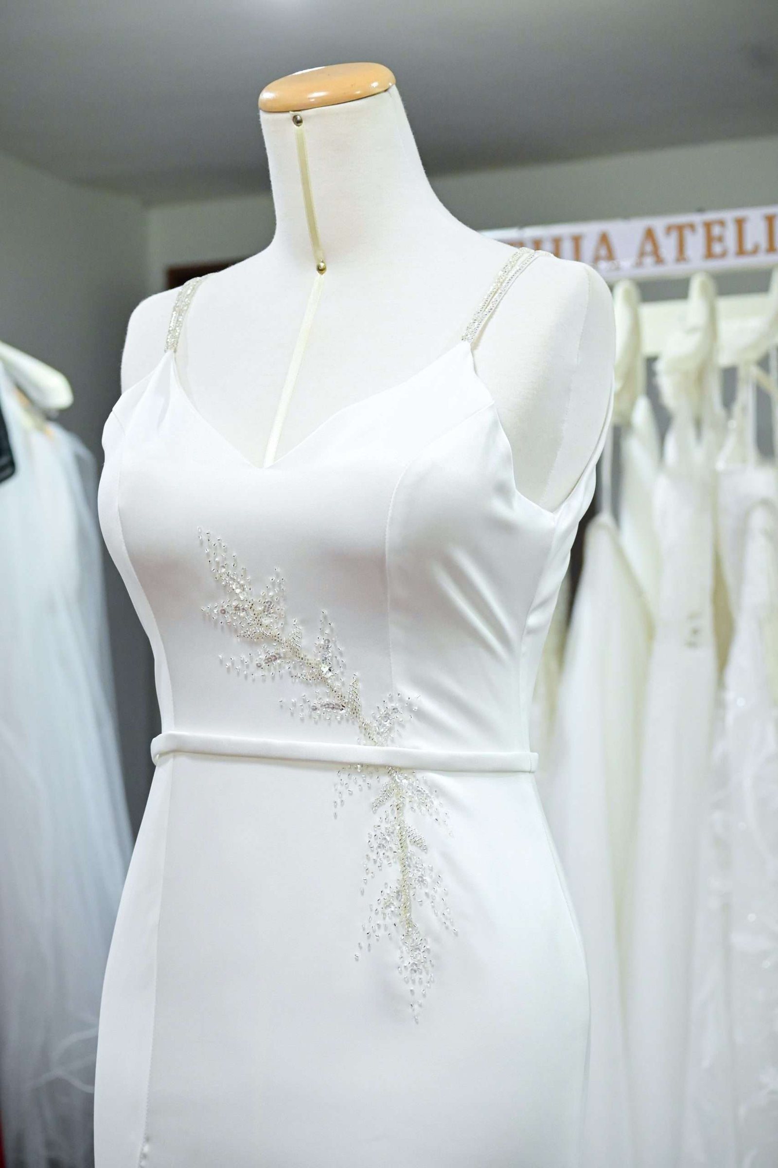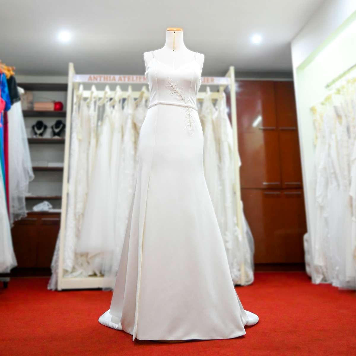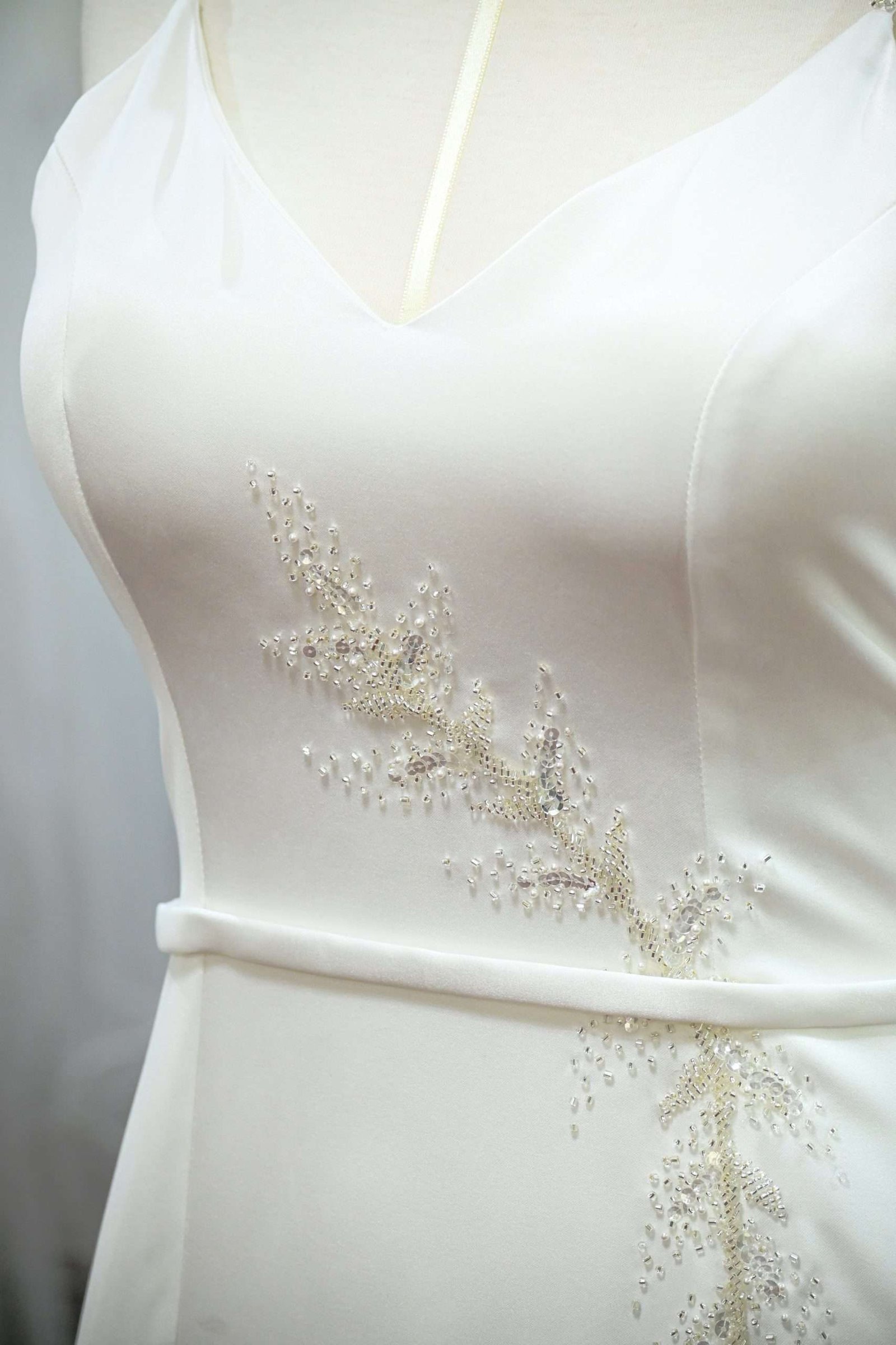 Vestido de novia semi-sirena en razo con abertura en la pierna, aplicación de pedrería.