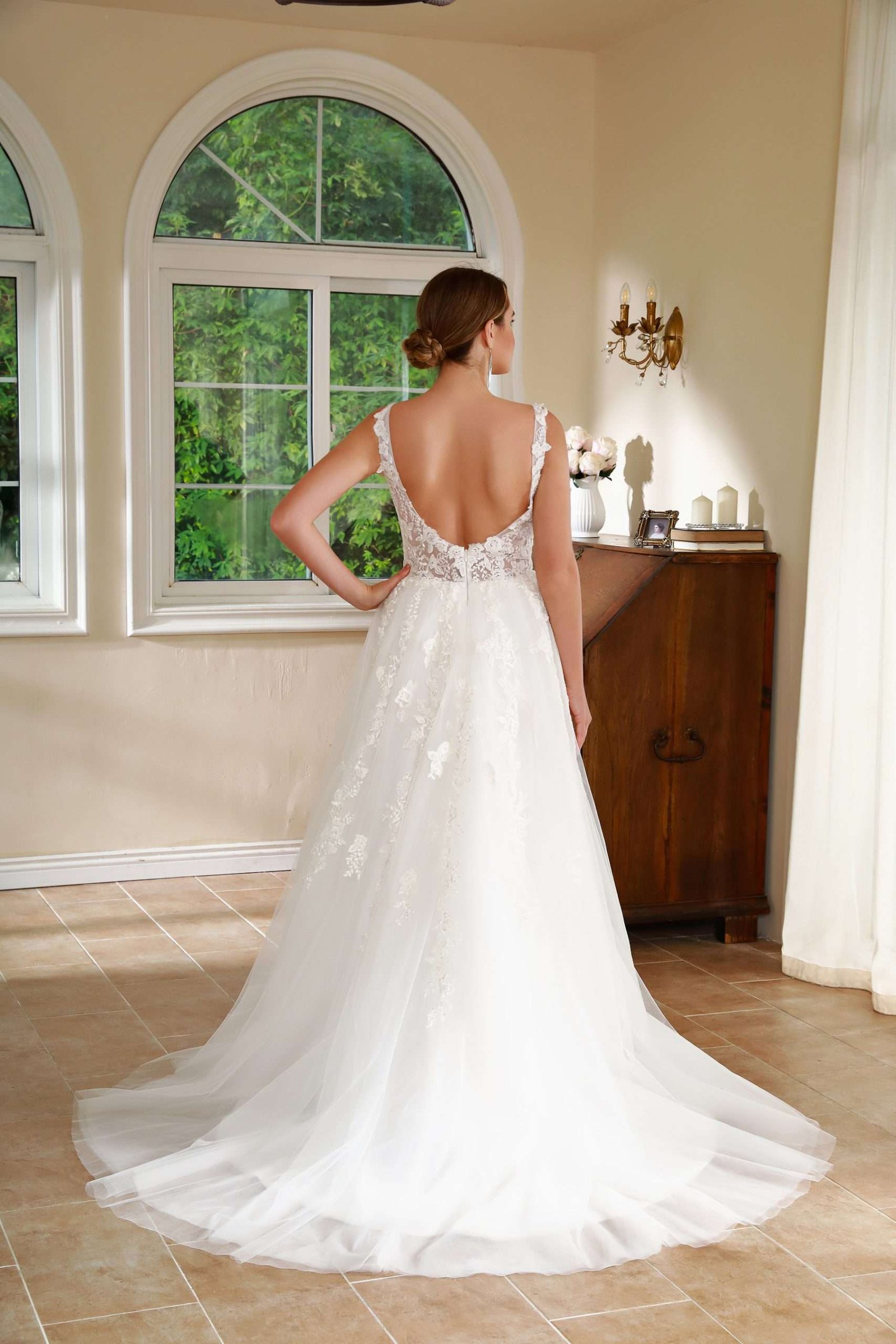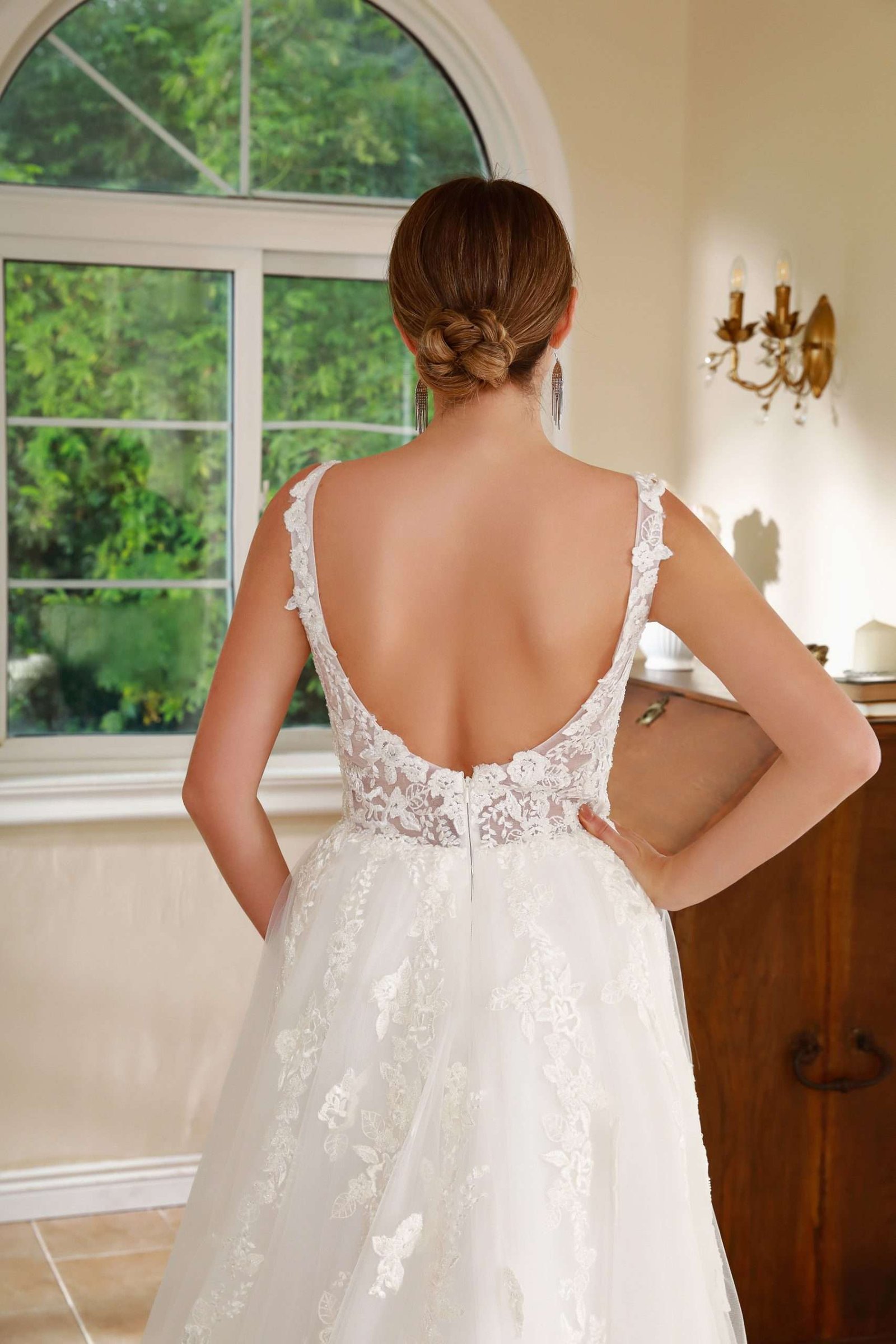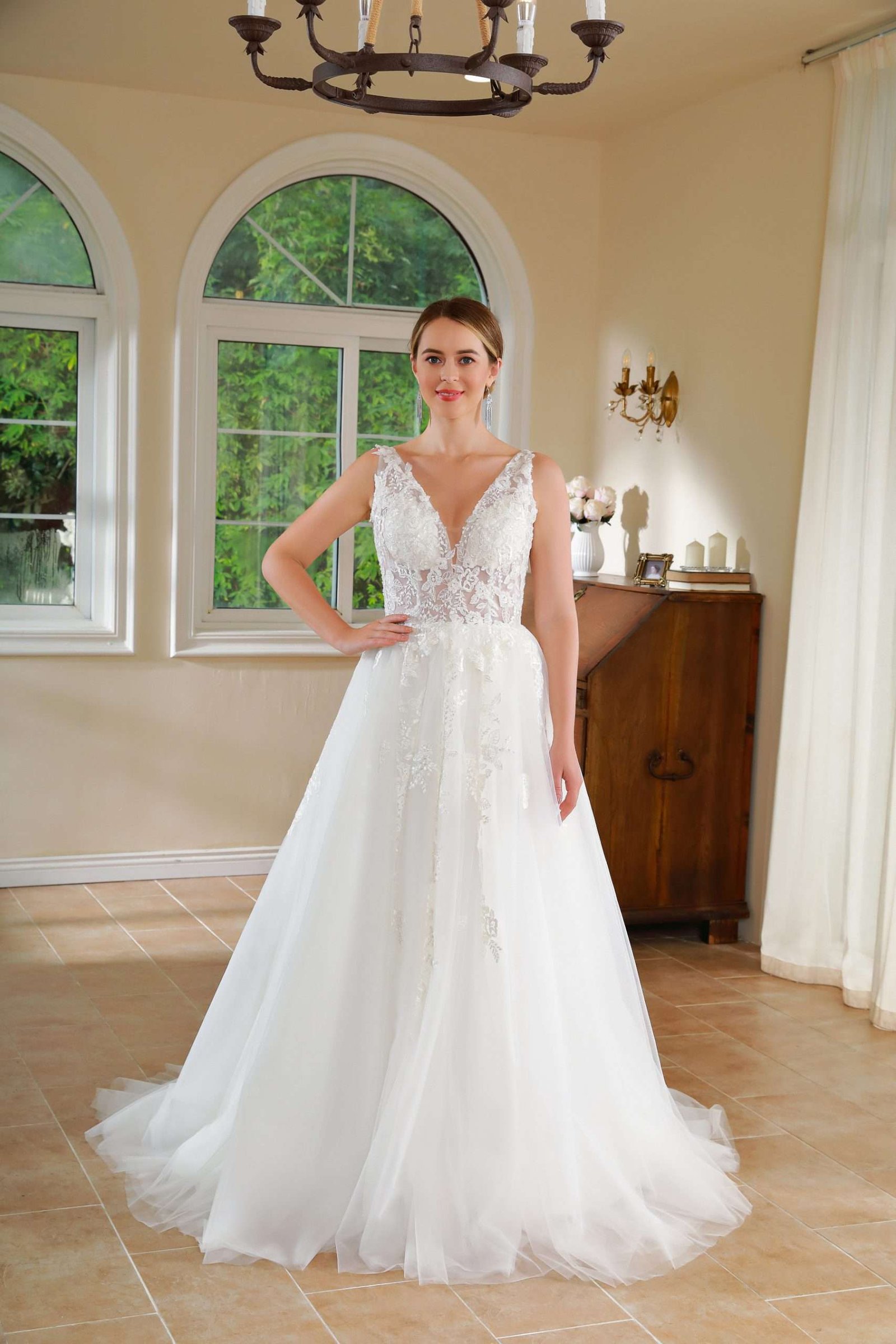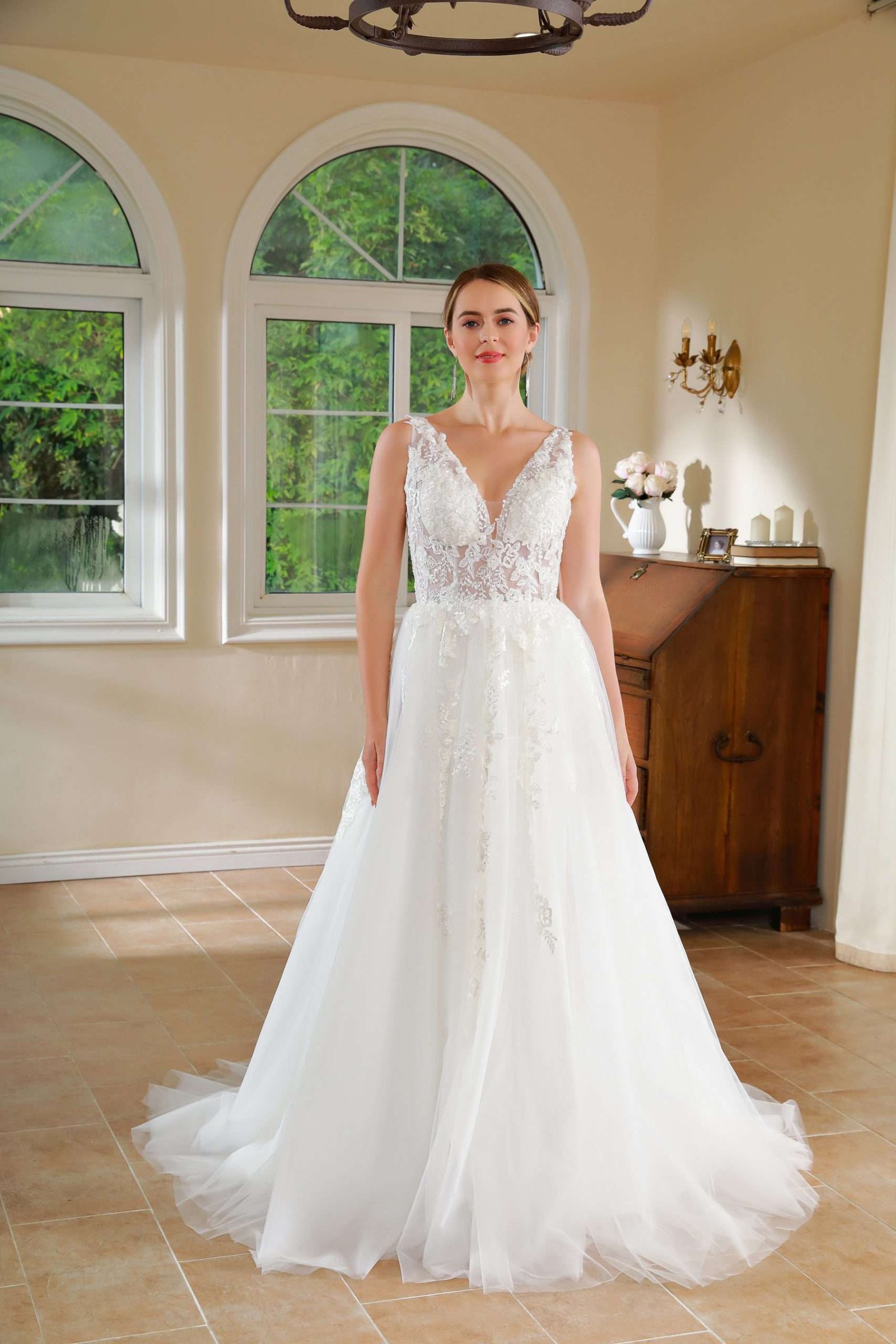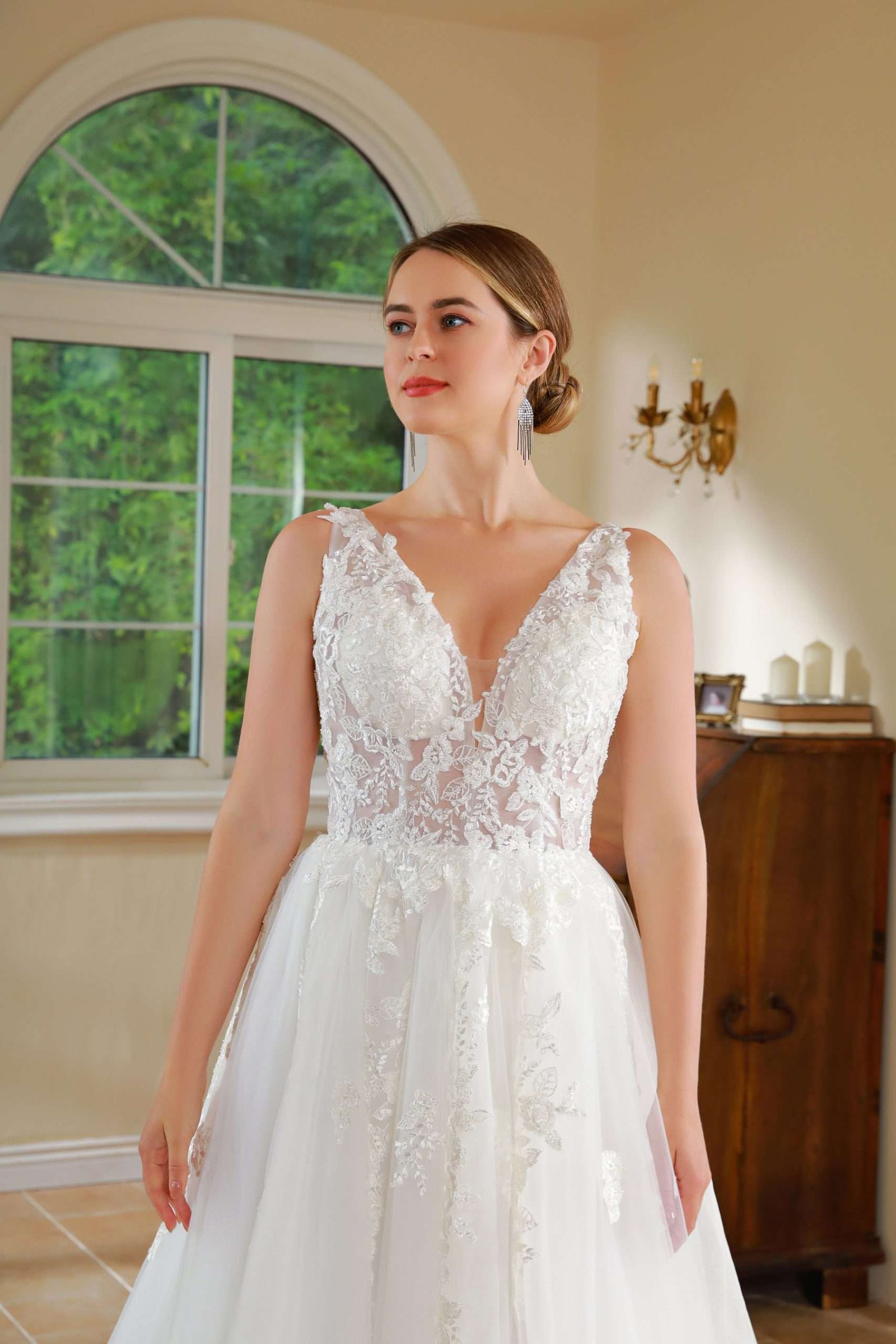 Vestido en A, con apliques en corset escote en v.