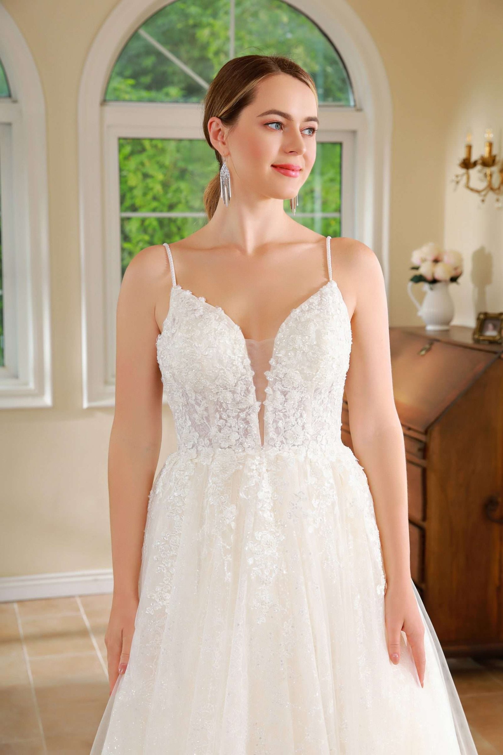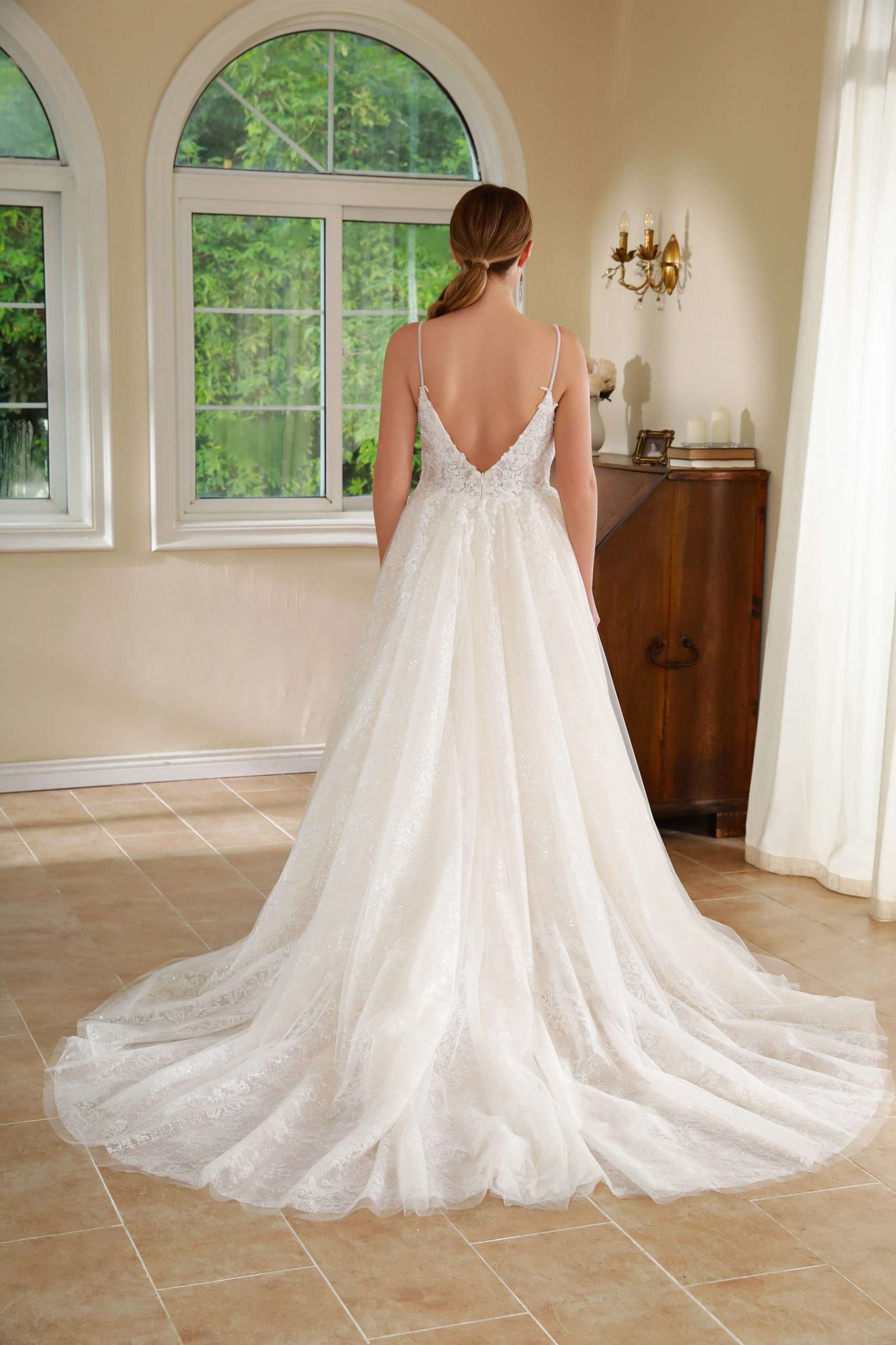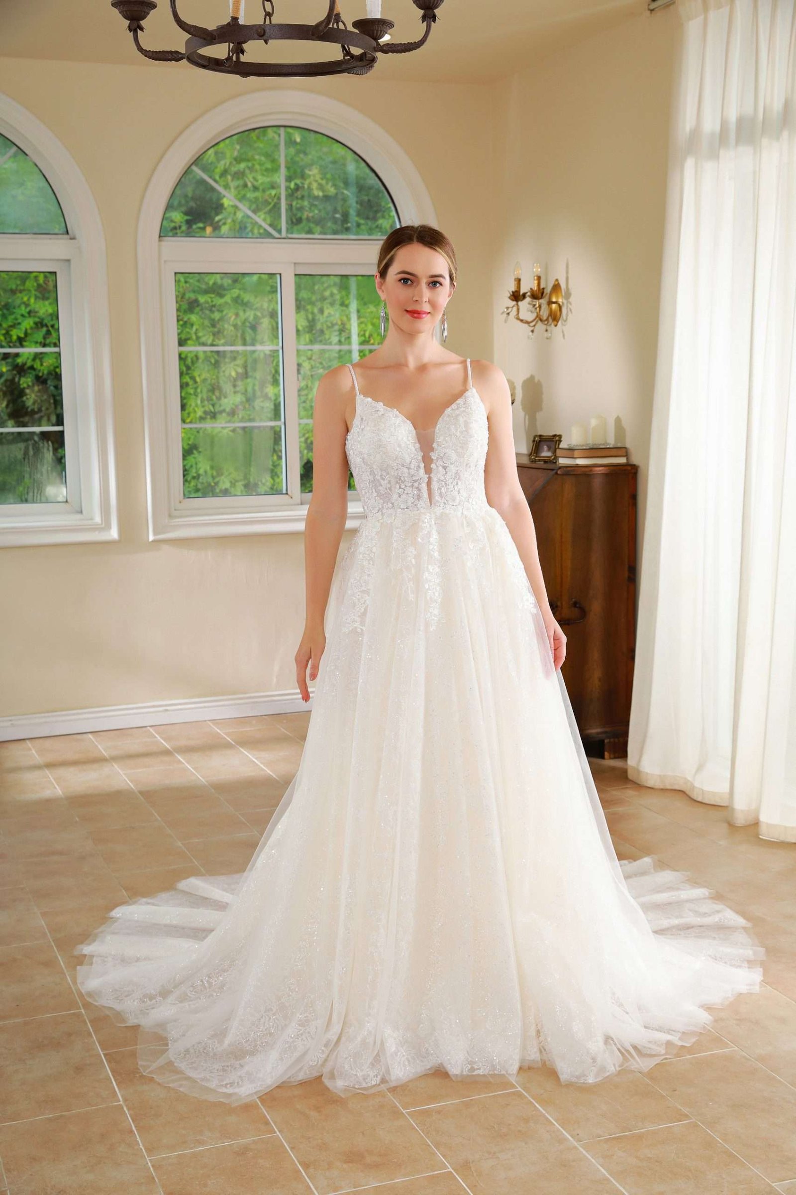 Vestido en corte A con tiras super delicadas corpiño de encaje y falda limpia.