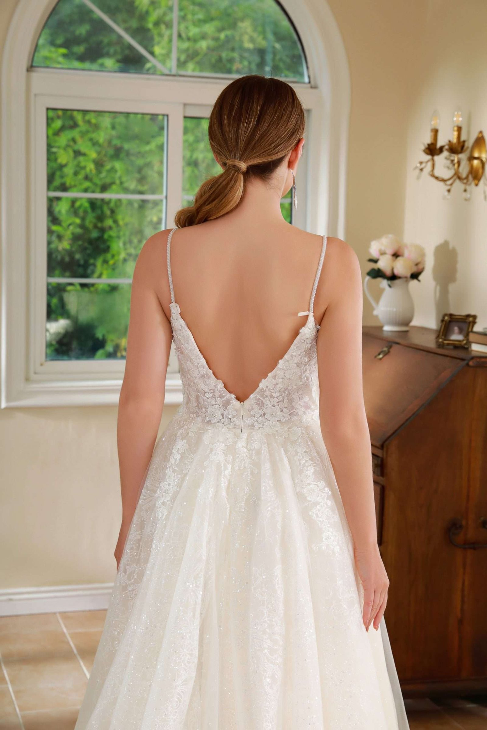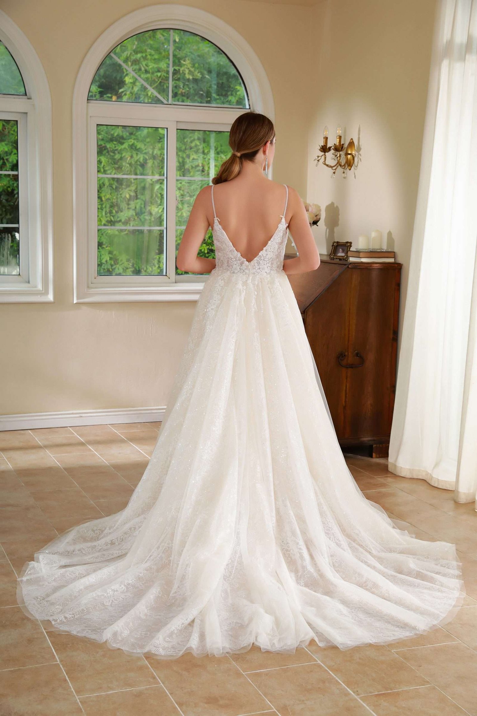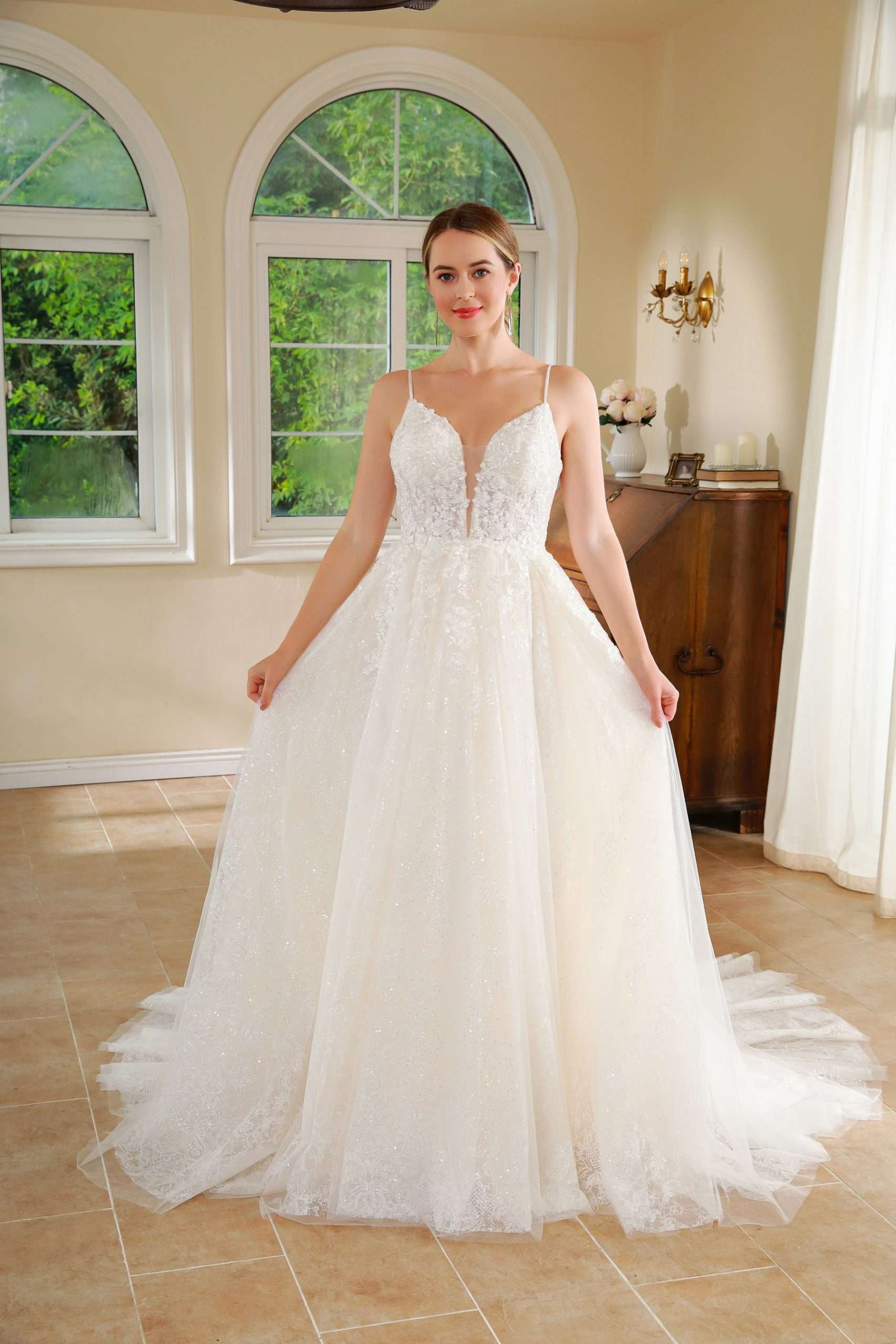Vestido en corte A con tiras super delicadas corpiño de encaje y falda limpia.