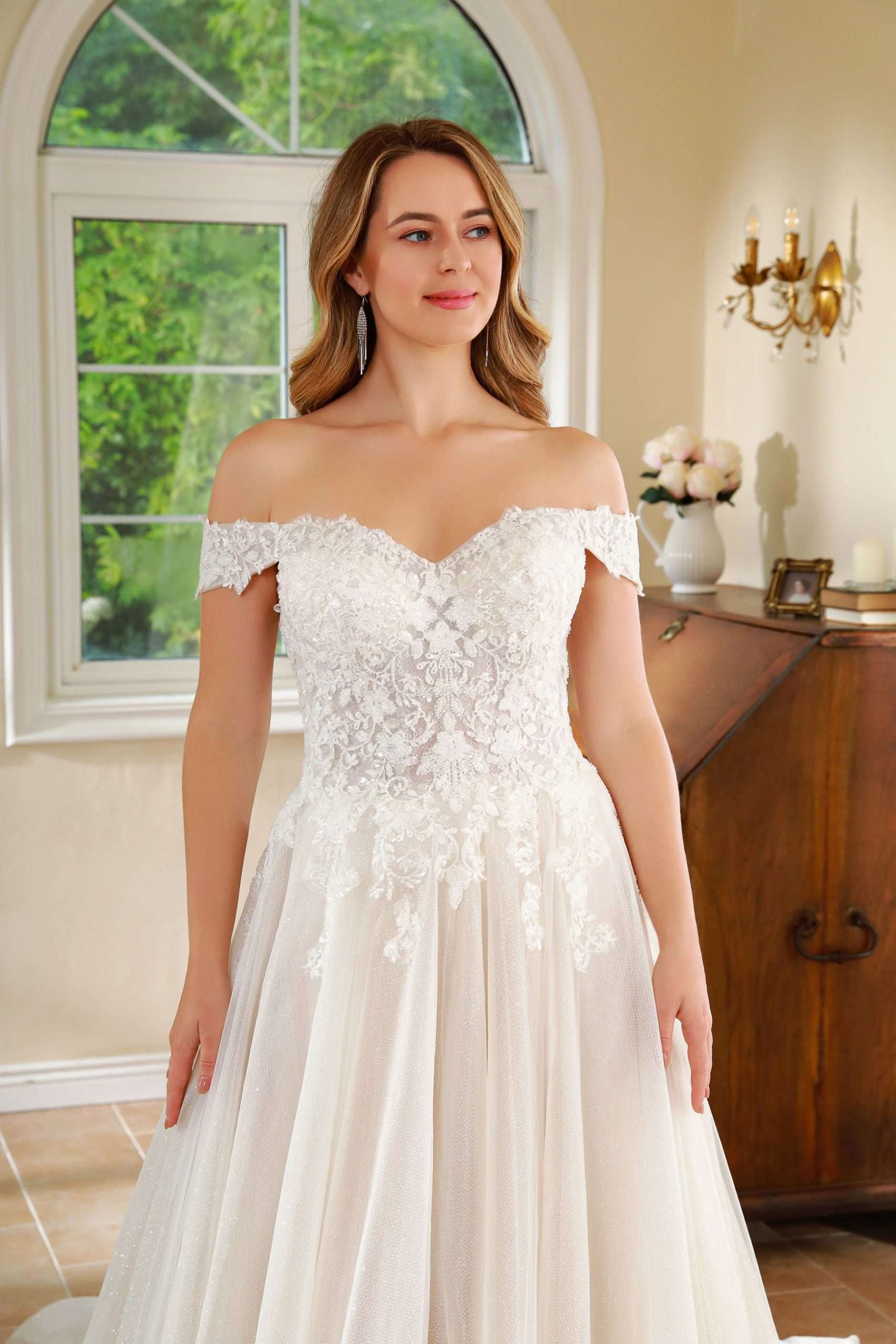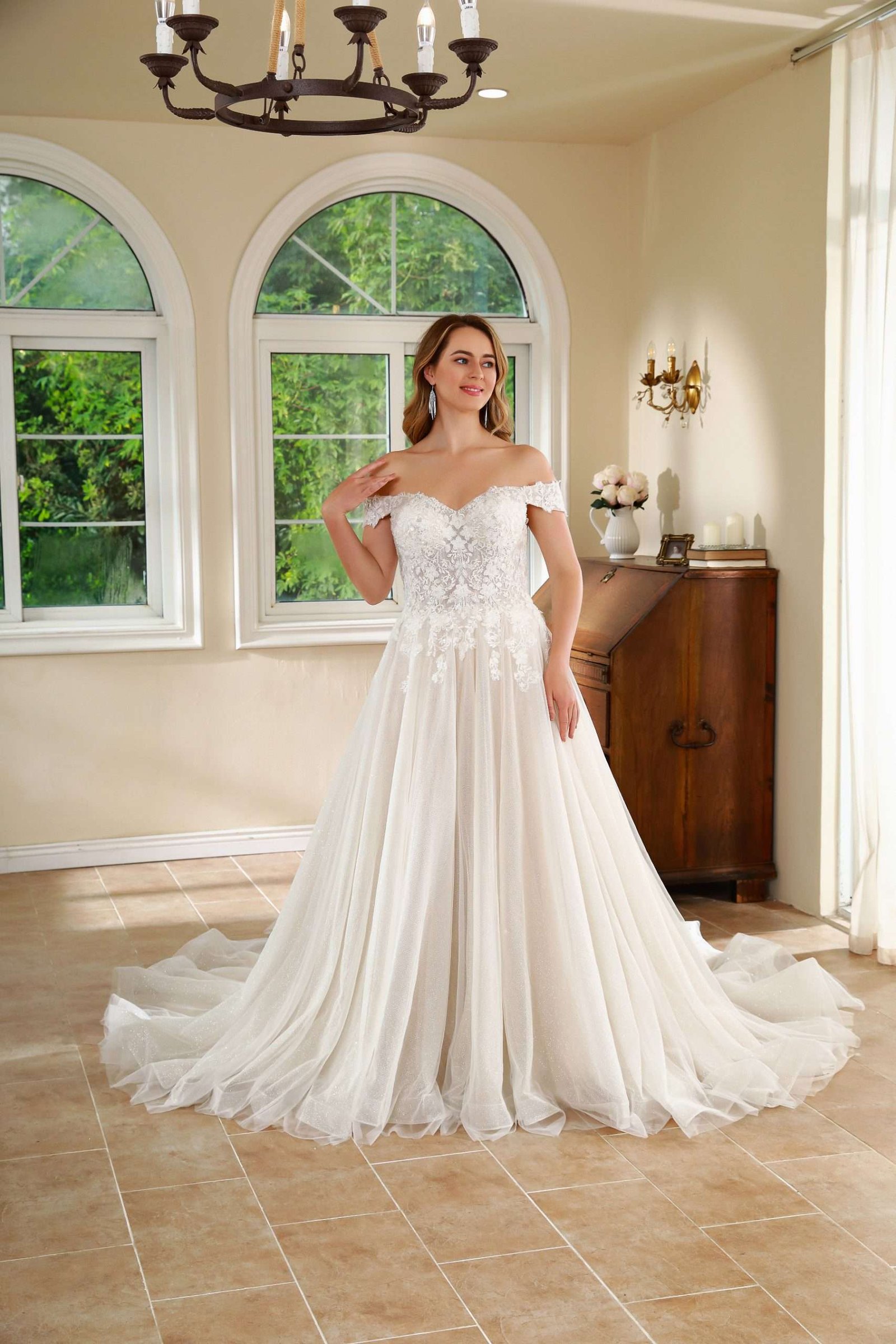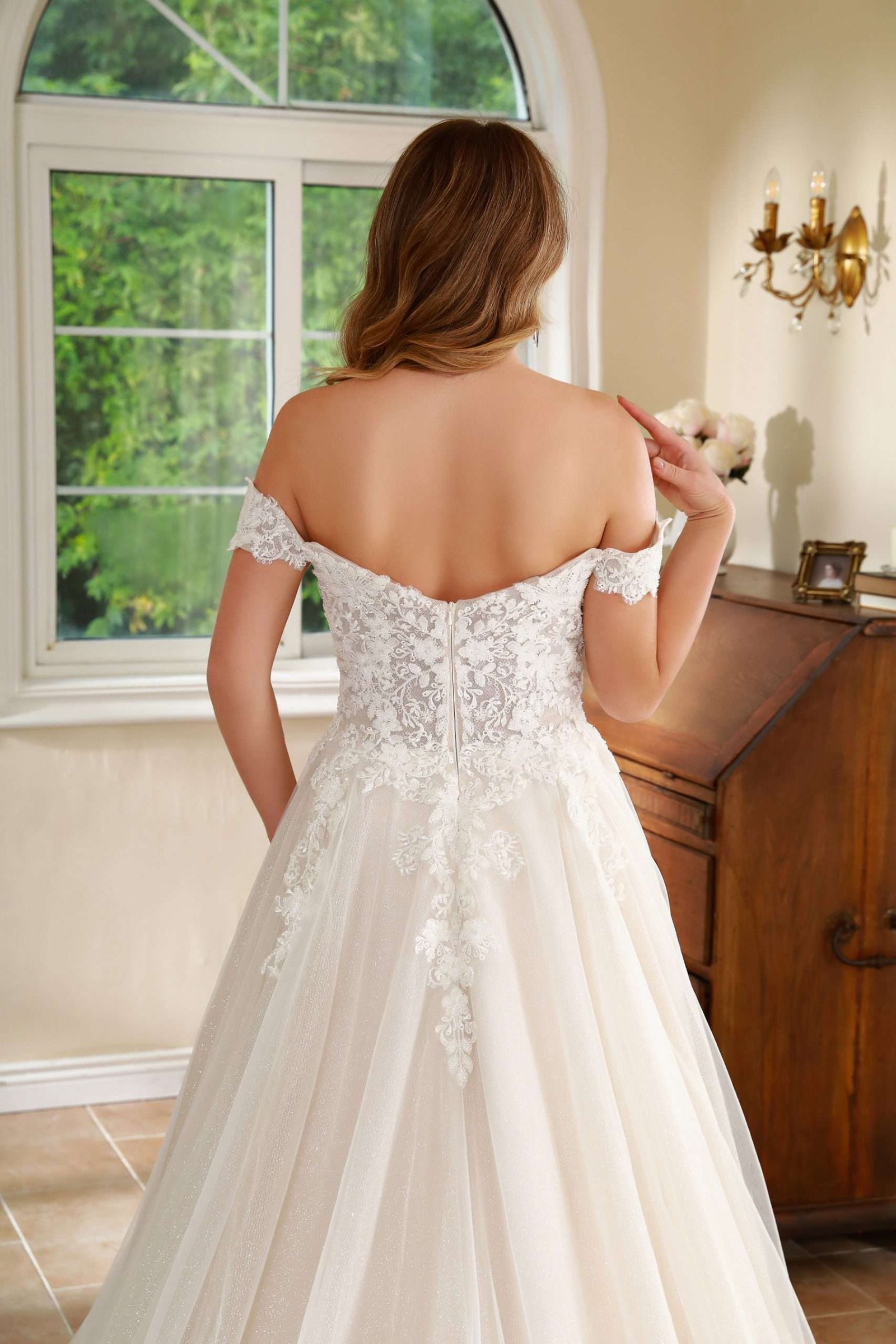 Vestido en A con corte corazón, mangas caídas y falda limpia en tull.