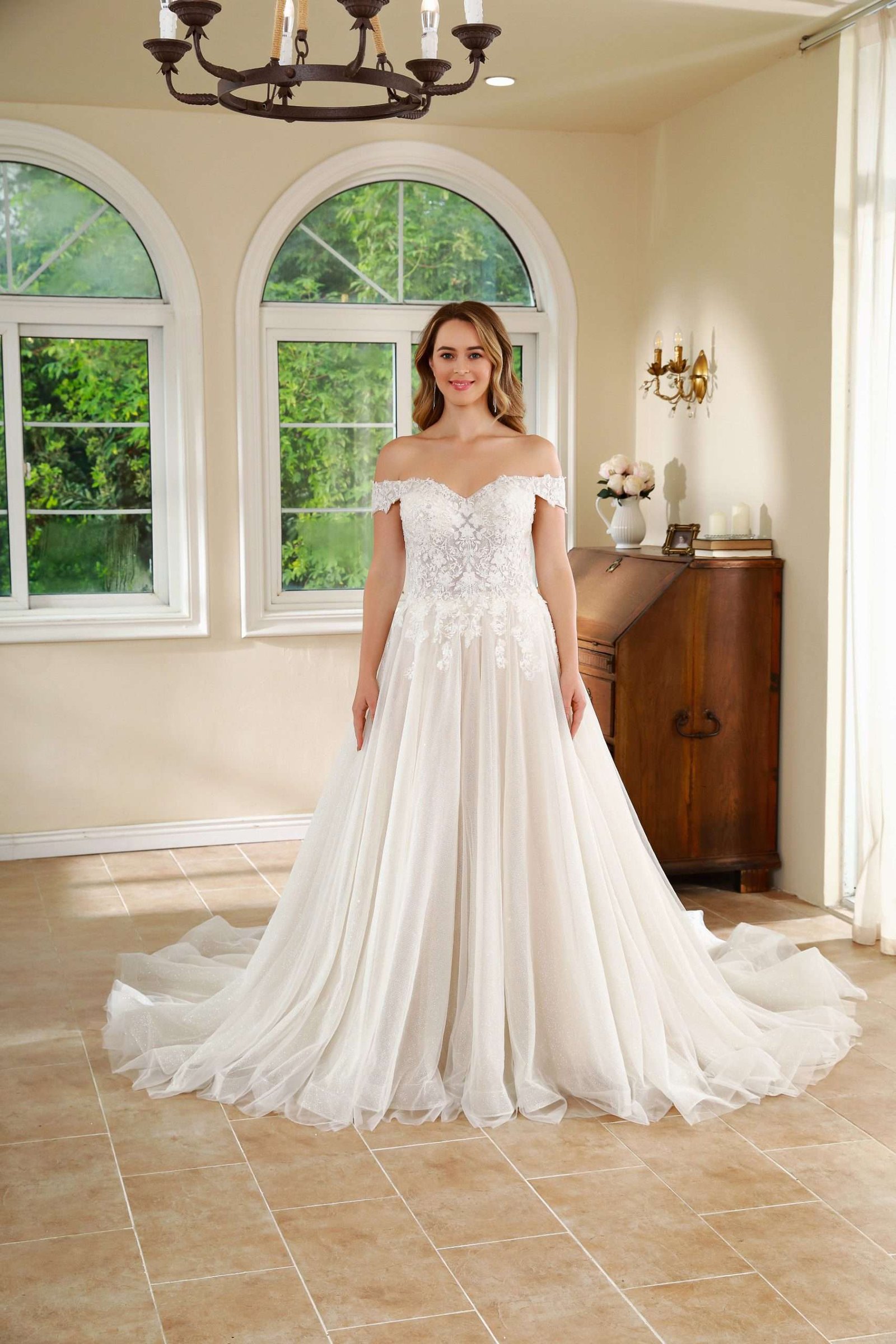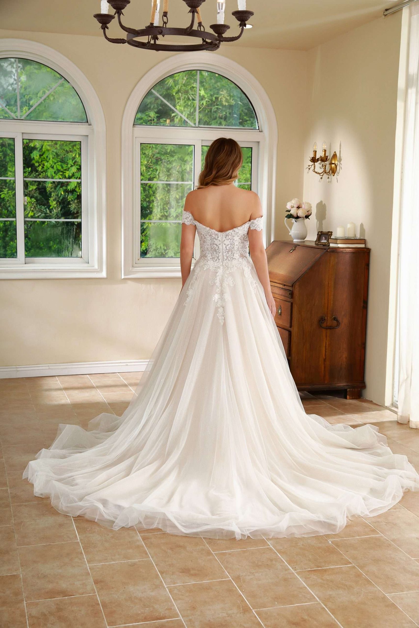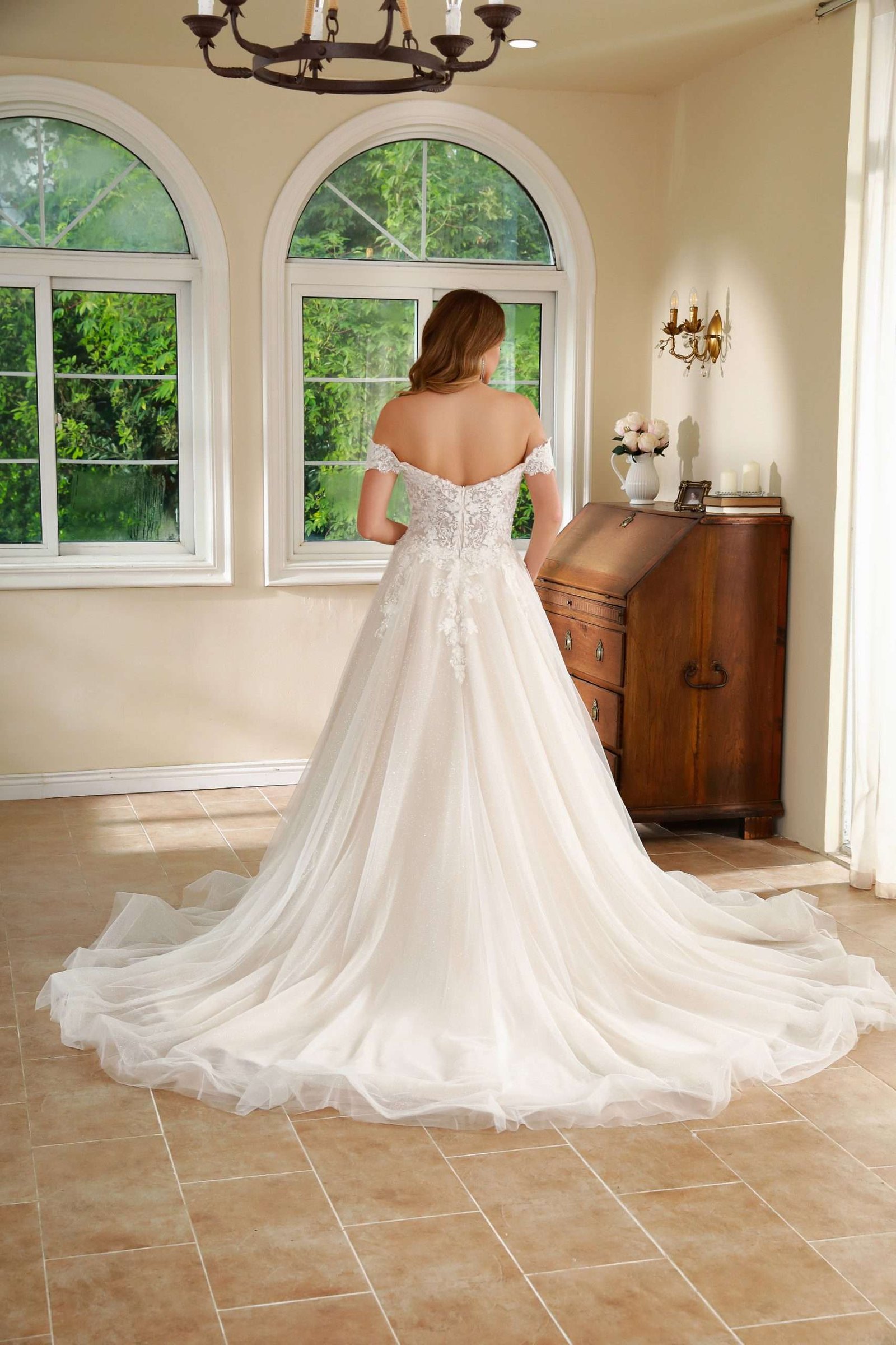 Vestido en A con corte corazón, mangas caídas y falda limpia en tull.