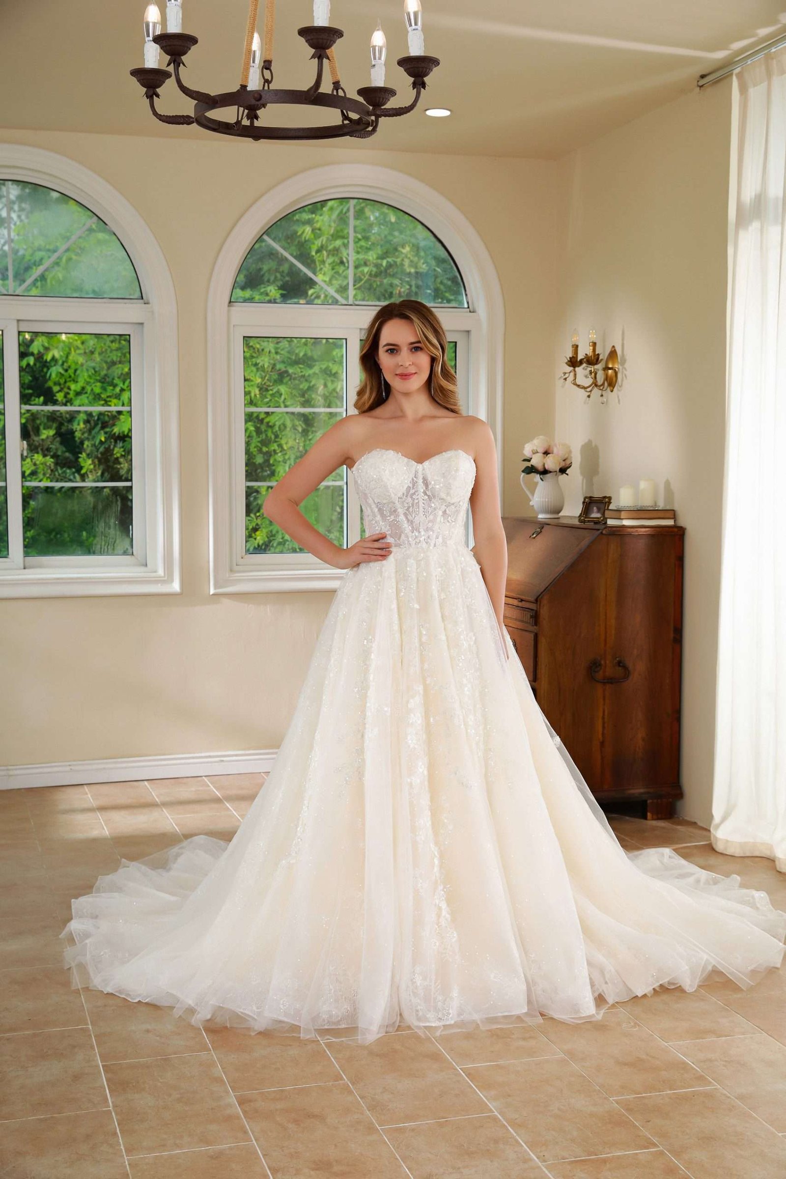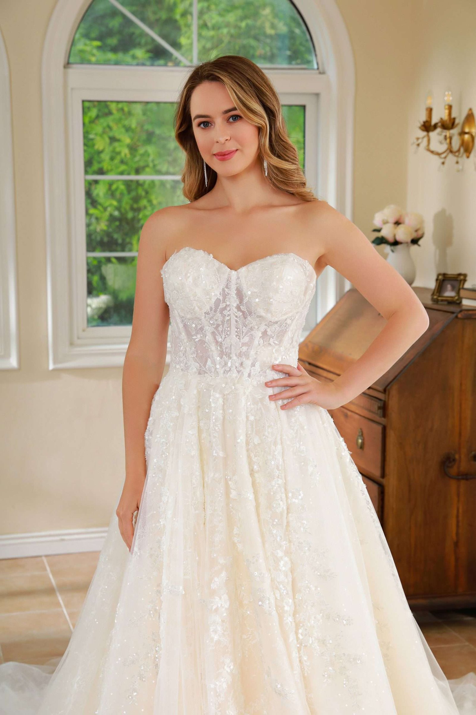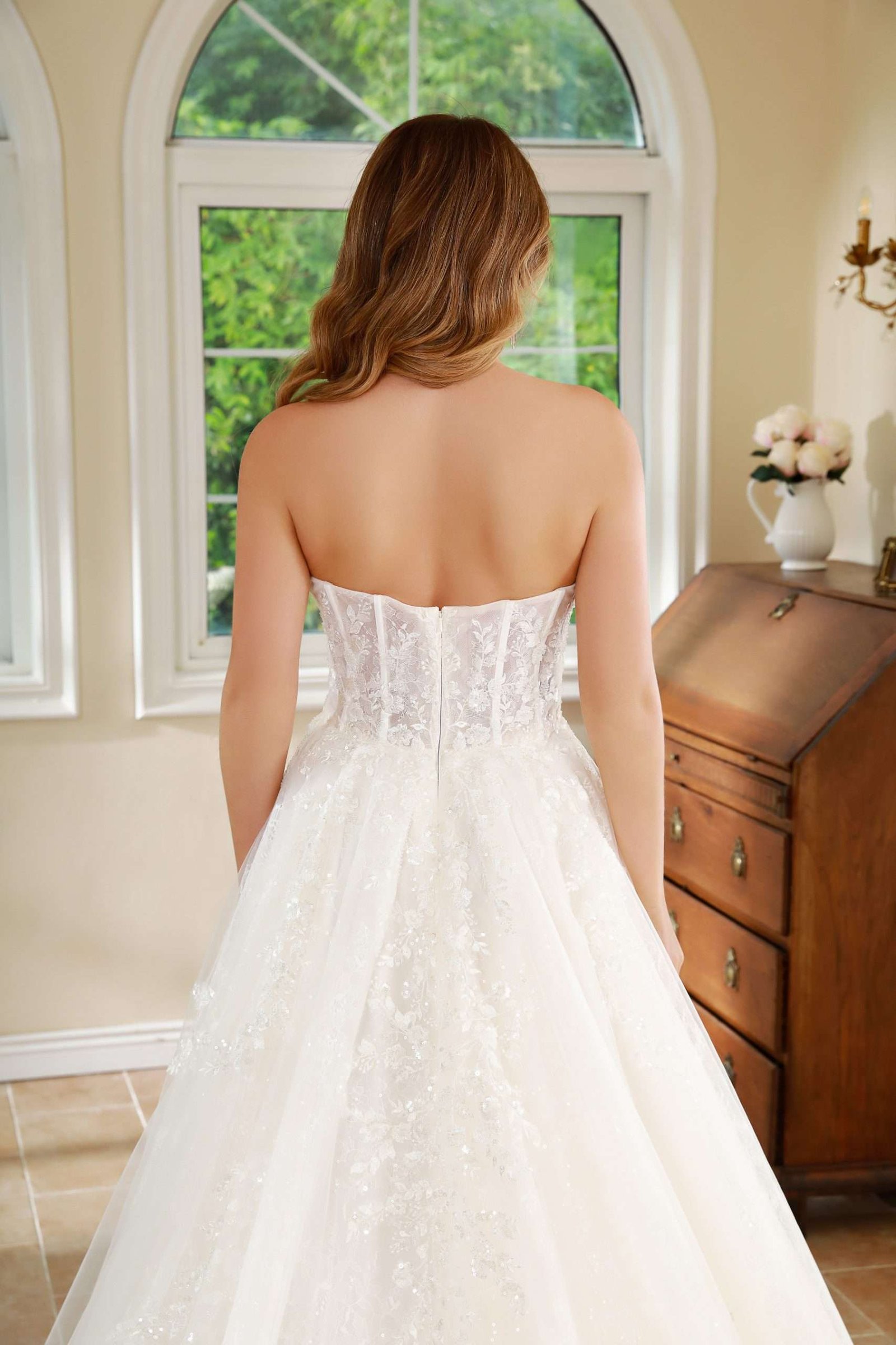 Vestido en straple en corte princesa con un corpiño bien estructurado a barbas y falda limpia con Bruselas.