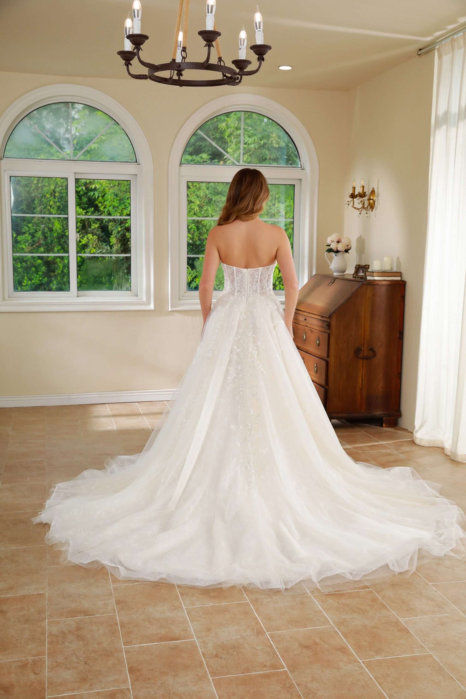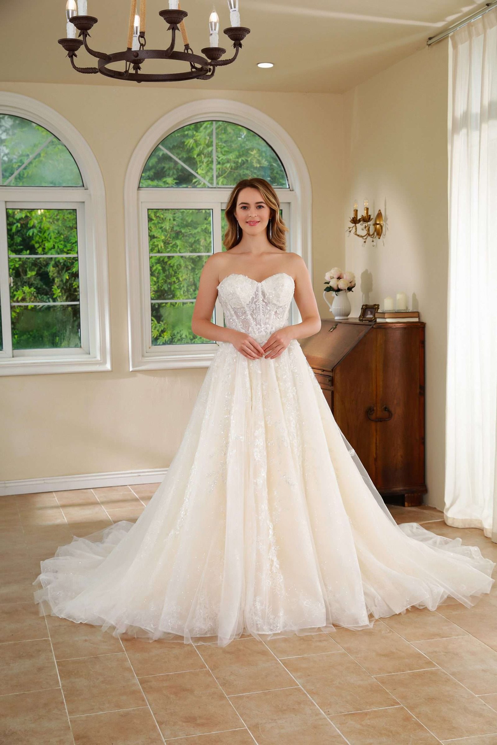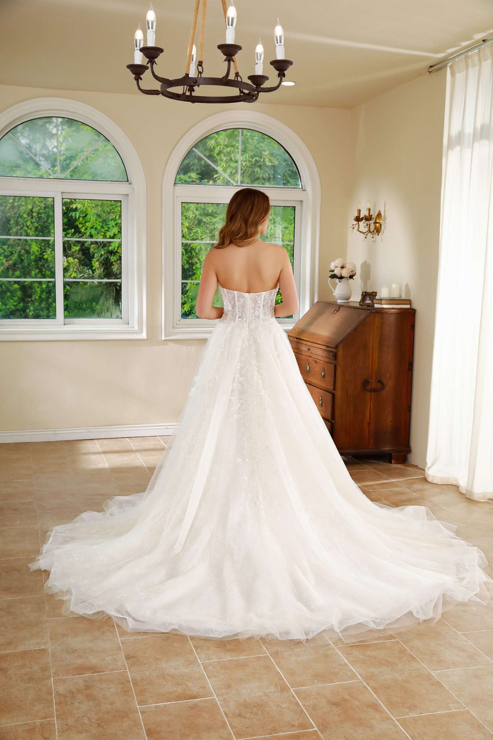 Vestido en straple en corte princesa con un corpiño bien estructurado a barbas y falda limpia con Bruselas.