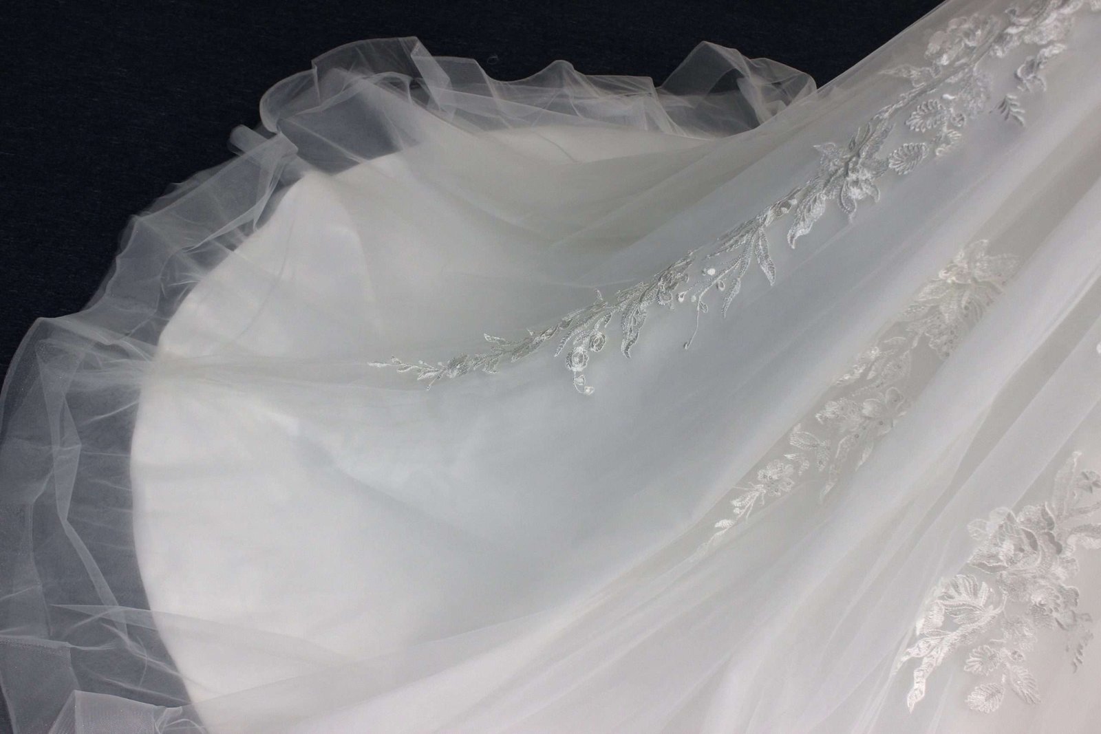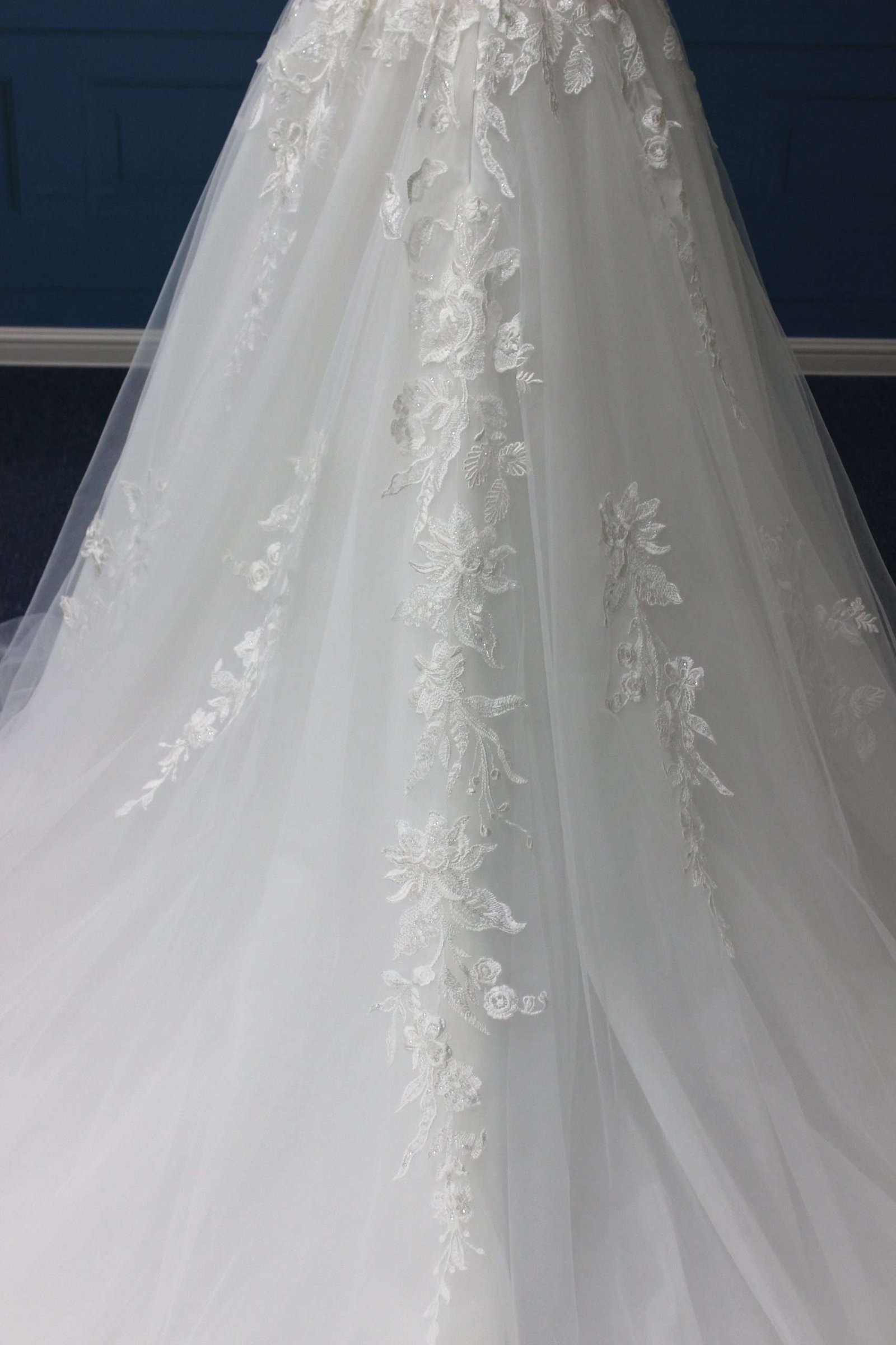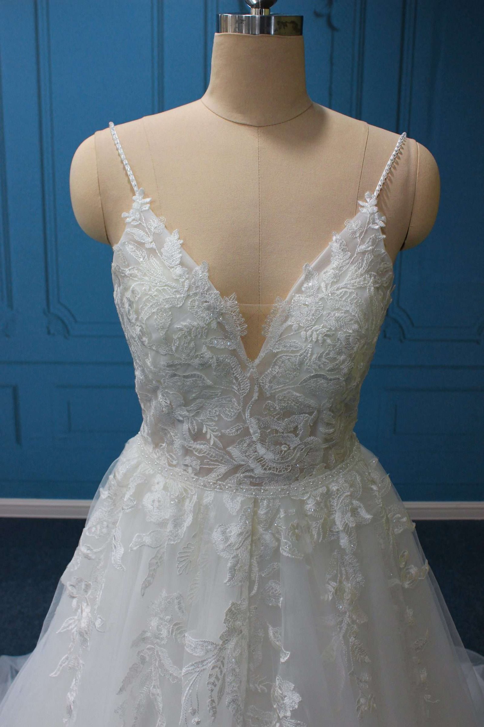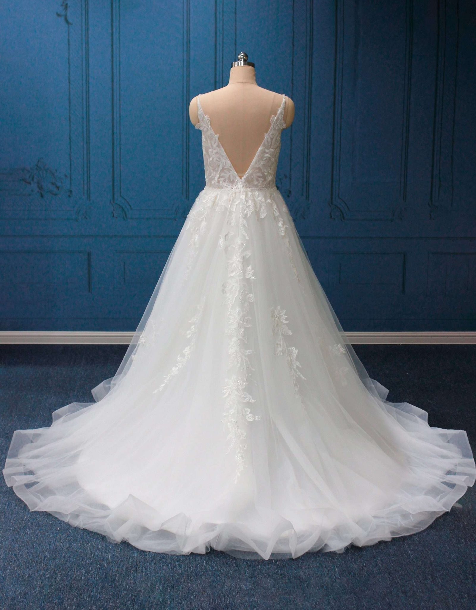 Vestido encantador en corte A con elegantes aplicaciones de encaje. Sumérgete en la sofisticación y el glamour con este espectacular vestido en corte A. Sus elegantes aplicaciones de encaje realzan la silueta, mientras que el escote en V, adornado con delicada pedrería en los tirantes, aporta un toque de lujo exquisito. Perfecto para la novia que busca una combinación de elegancia atemporal y detalles deslumbrantes.