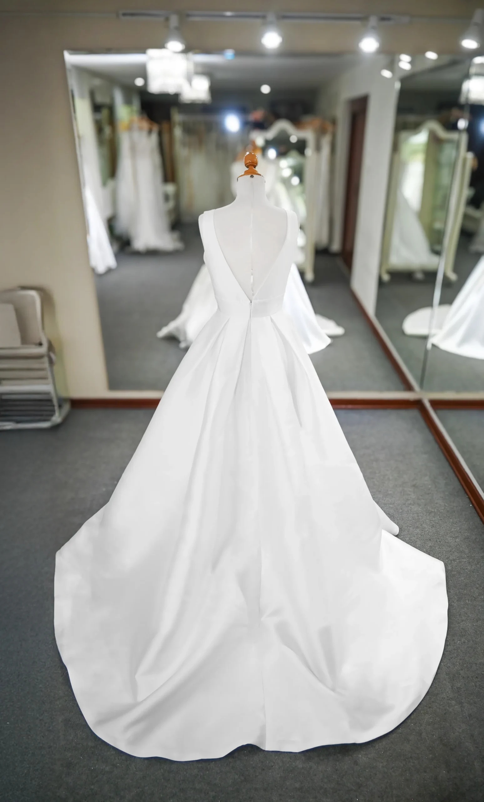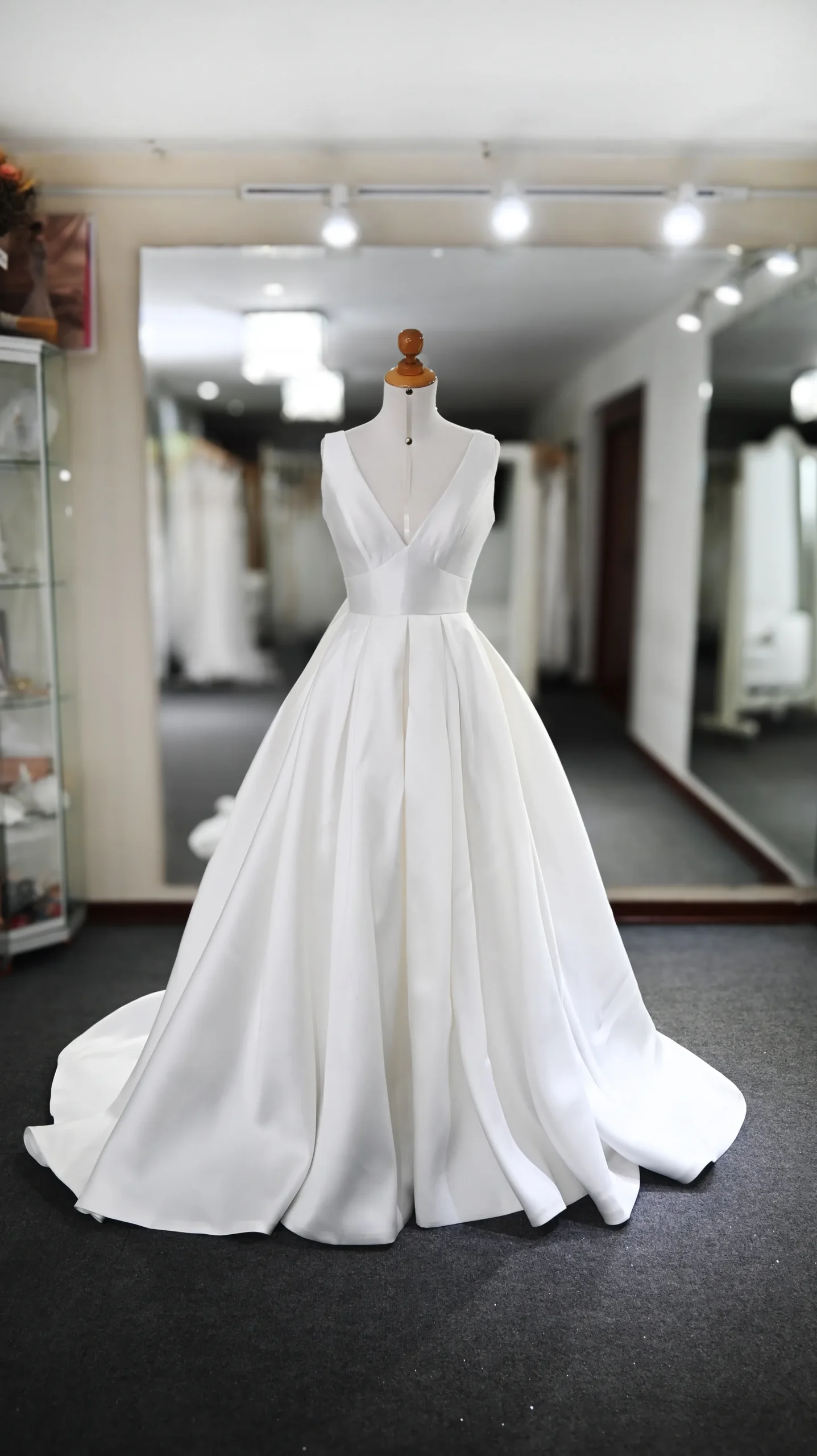 Vestido de novia en línea A con elegante falda de raso español que aporta estructura y caída impecable. El corpiño, sin mangas y con escote en “V”, está adornado con delicadas aplicaciones de pedrería. Un diseño ideal para novias que buscan un estilo clásico con toques de brillo refinado.