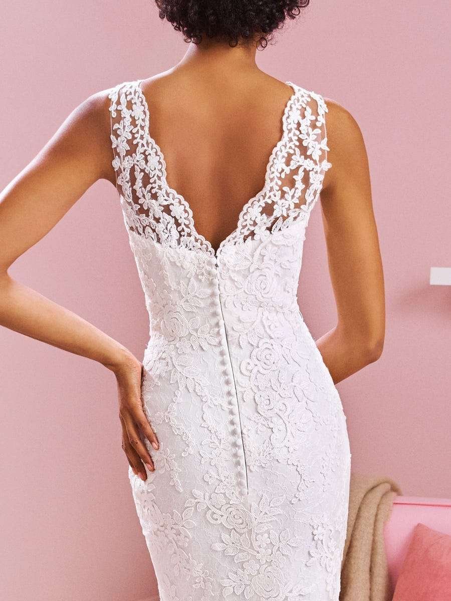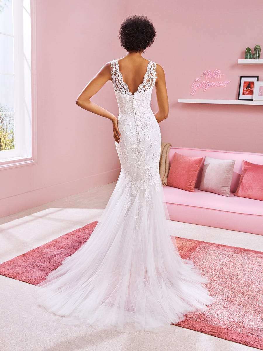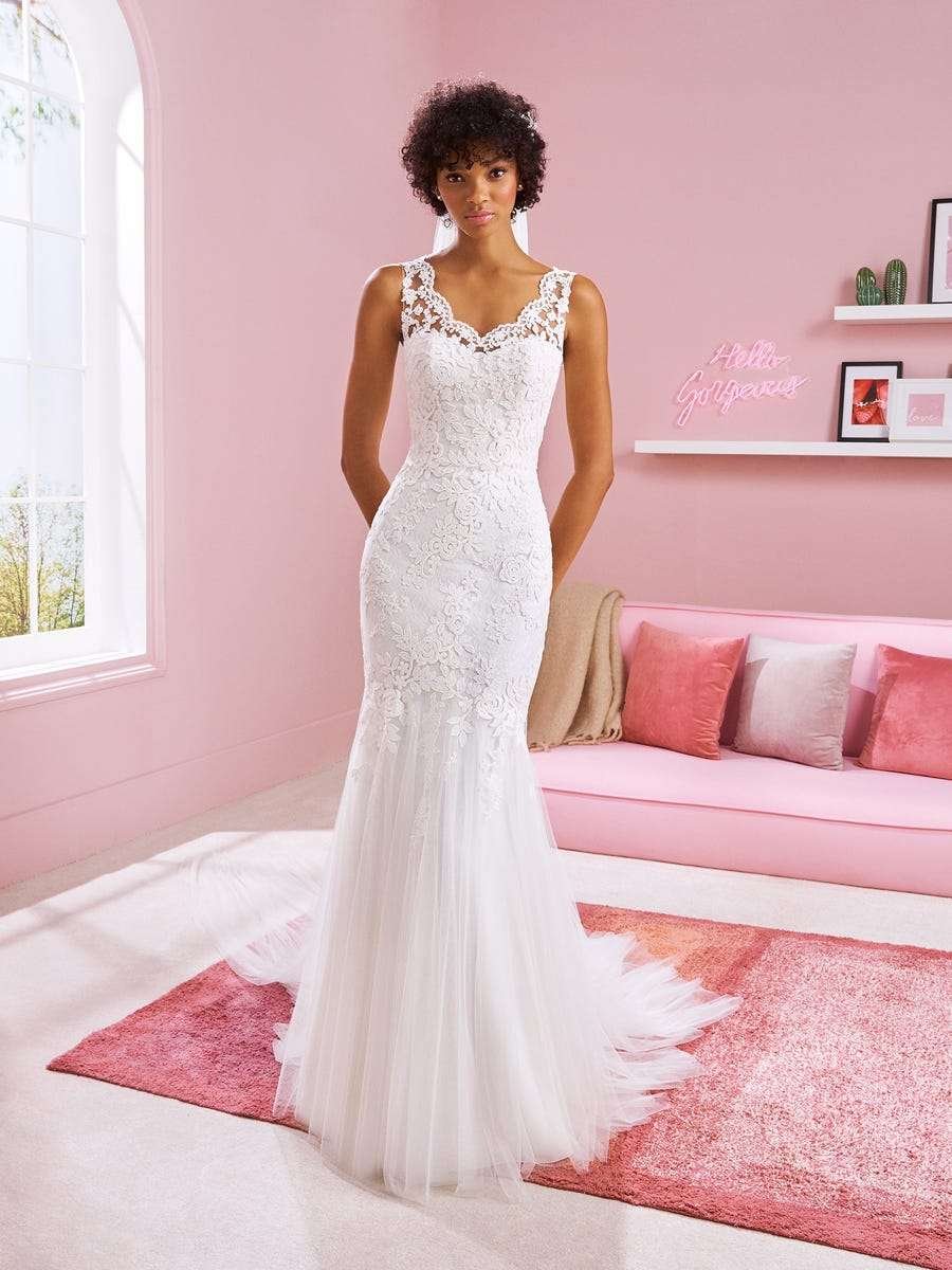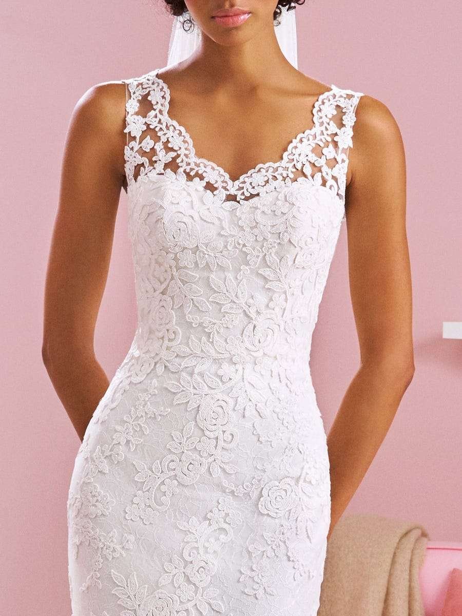Vestido ajustado con un precioso escote ondulado, tirantes ilusión y una silueta decorada con maravillosas rosas que envuelven el diseño y se funden con la cola de tul.