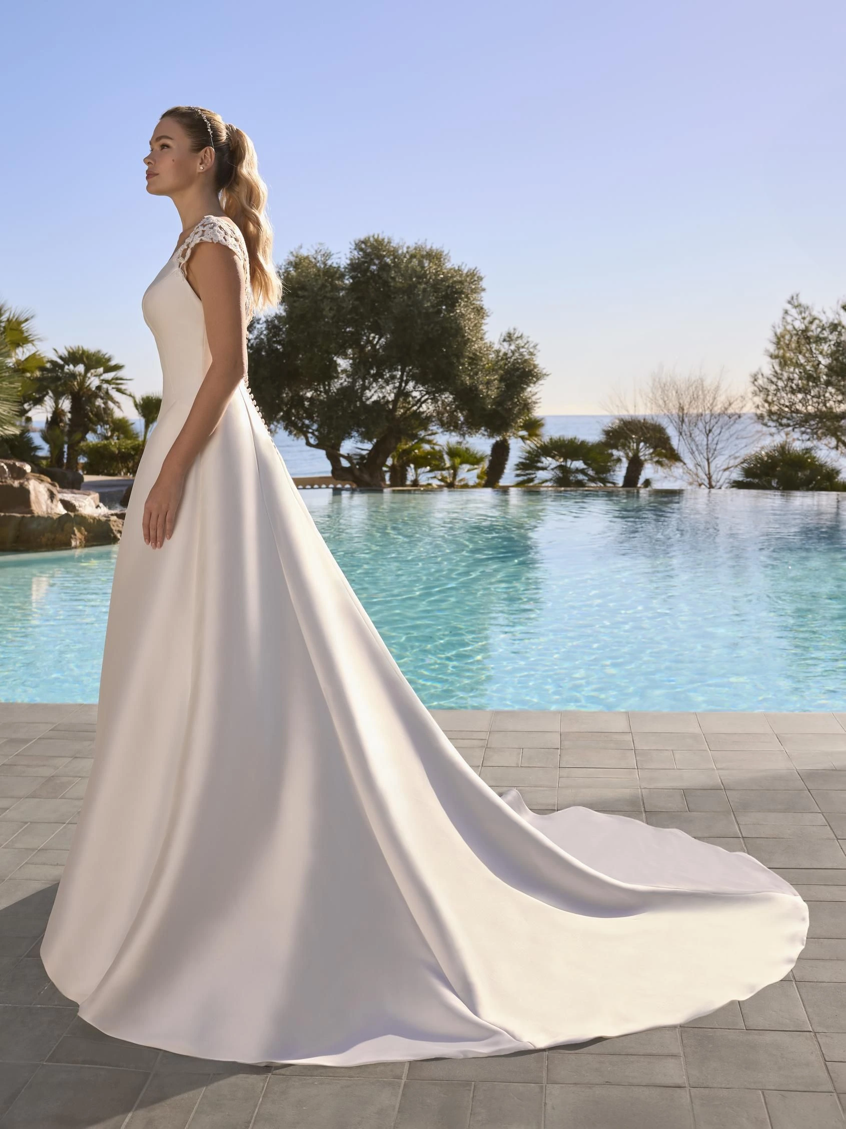 Exquisitamente elaborado, este vestido combina escote y espalda en V con tul brillante, encaje y abalorios intrincados. Una elección perfecta para una ocasión elegante e inolvidable.