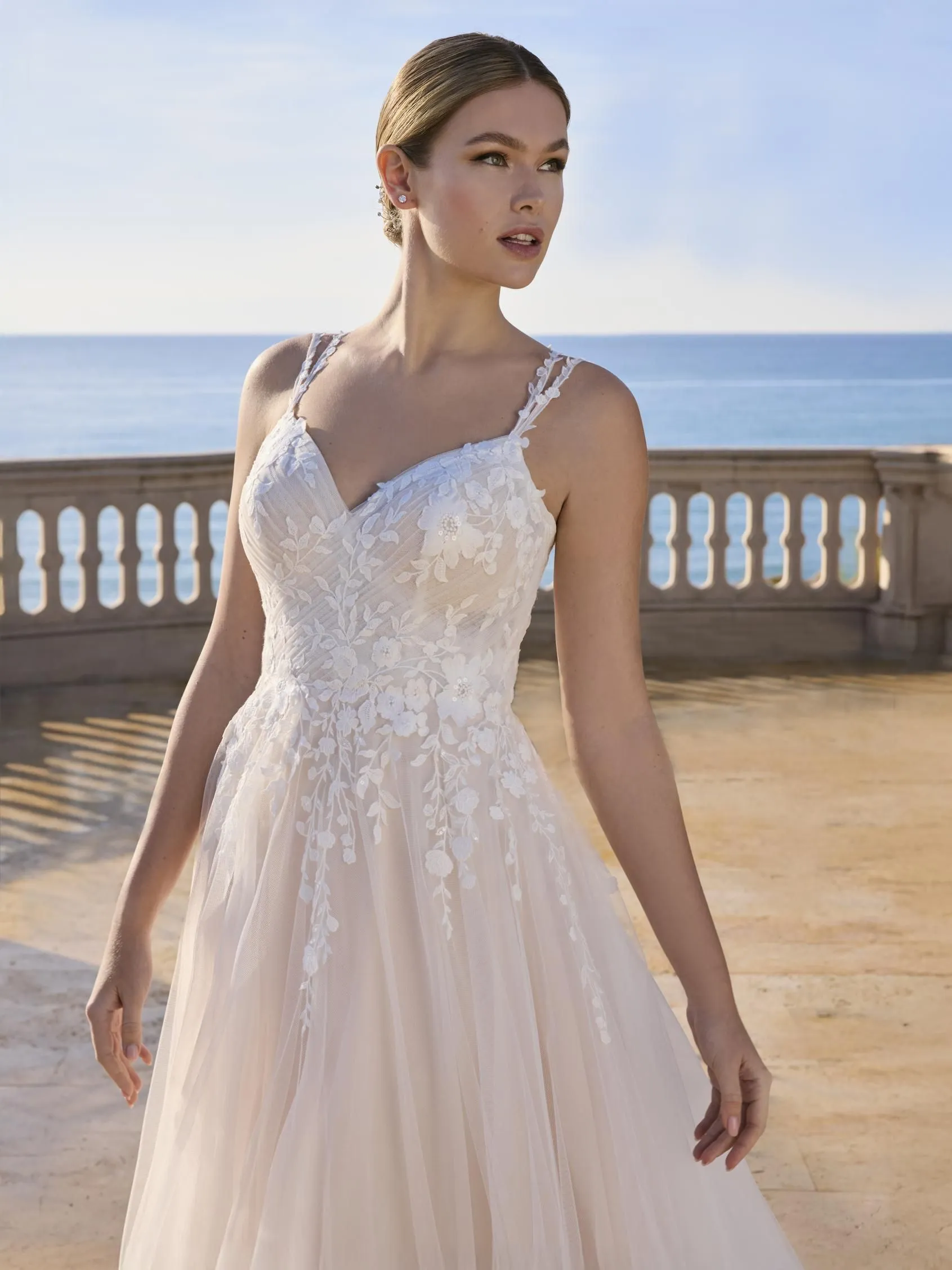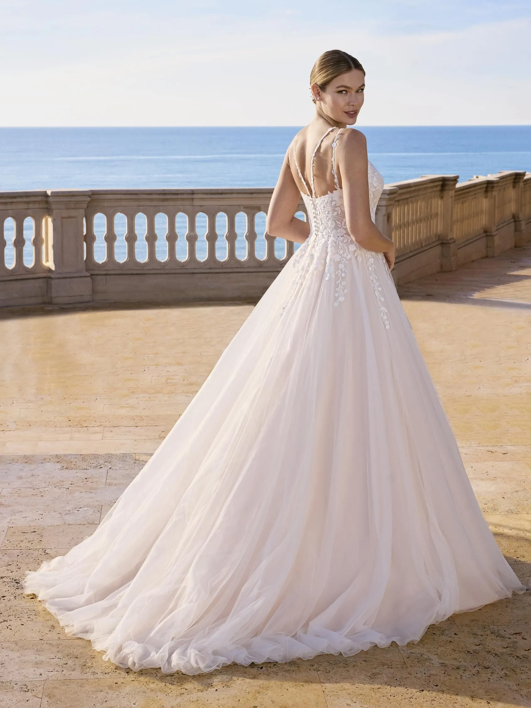 Romántico y refinado, este vestido princesa con escote y espalda en V está confeccionado en tul suave, realzado con encaje y delicados adornos de cuentas. Una expresión elegante de feminidad moderna.