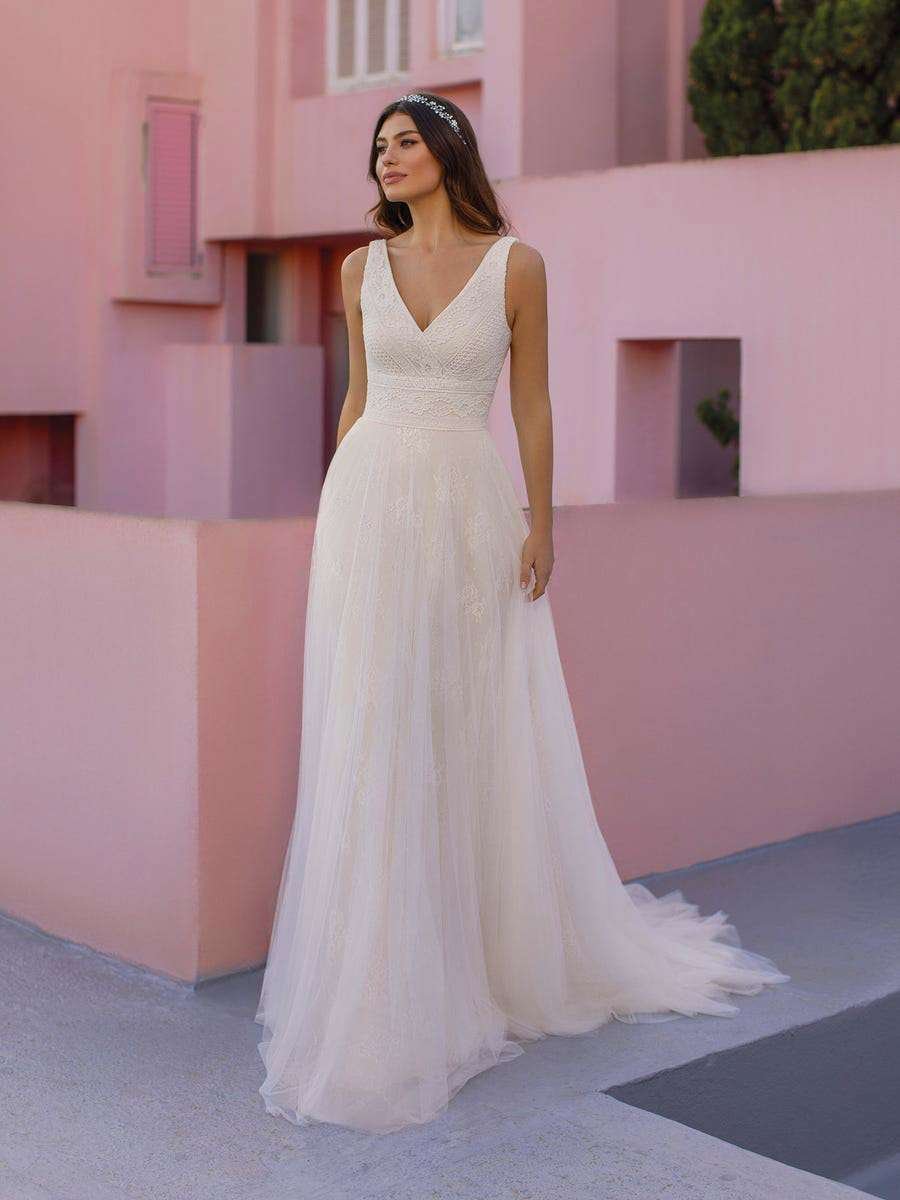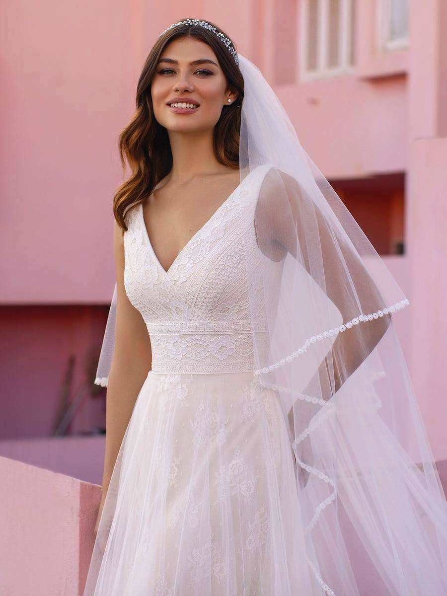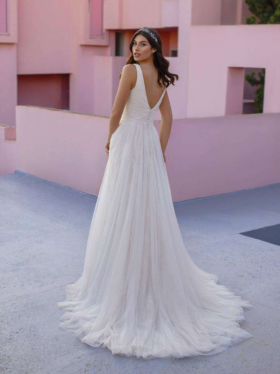 Delicado y ligero vestido de tul fino. Se compone de una falda ligeramente plisada y de un cuerpo con un perfecto cuello en pico ligeramente adornado con encaje de chantillí, así como de una preciosa cola de corte.