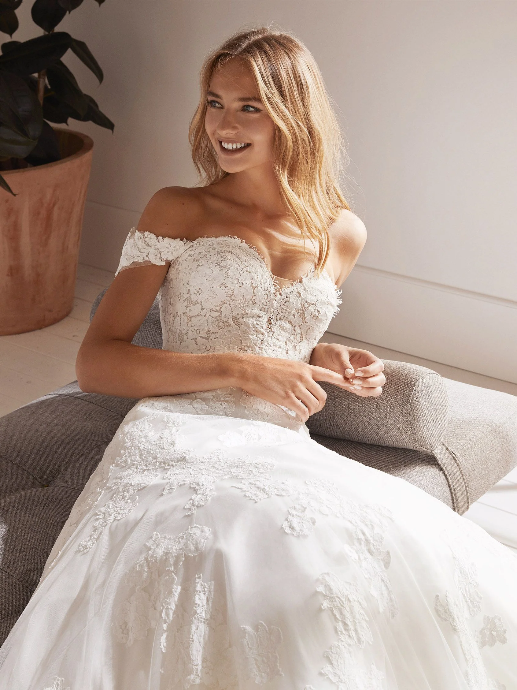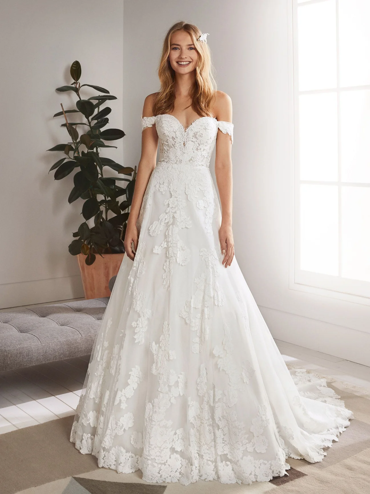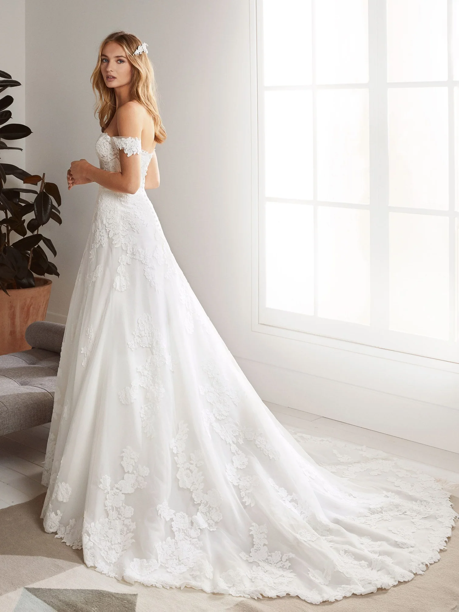Clásico vestido corte en A con mangas caídas y románticas, aplicaciones de encaje floral integral. Presenta un escote corazón y una escultural costura.