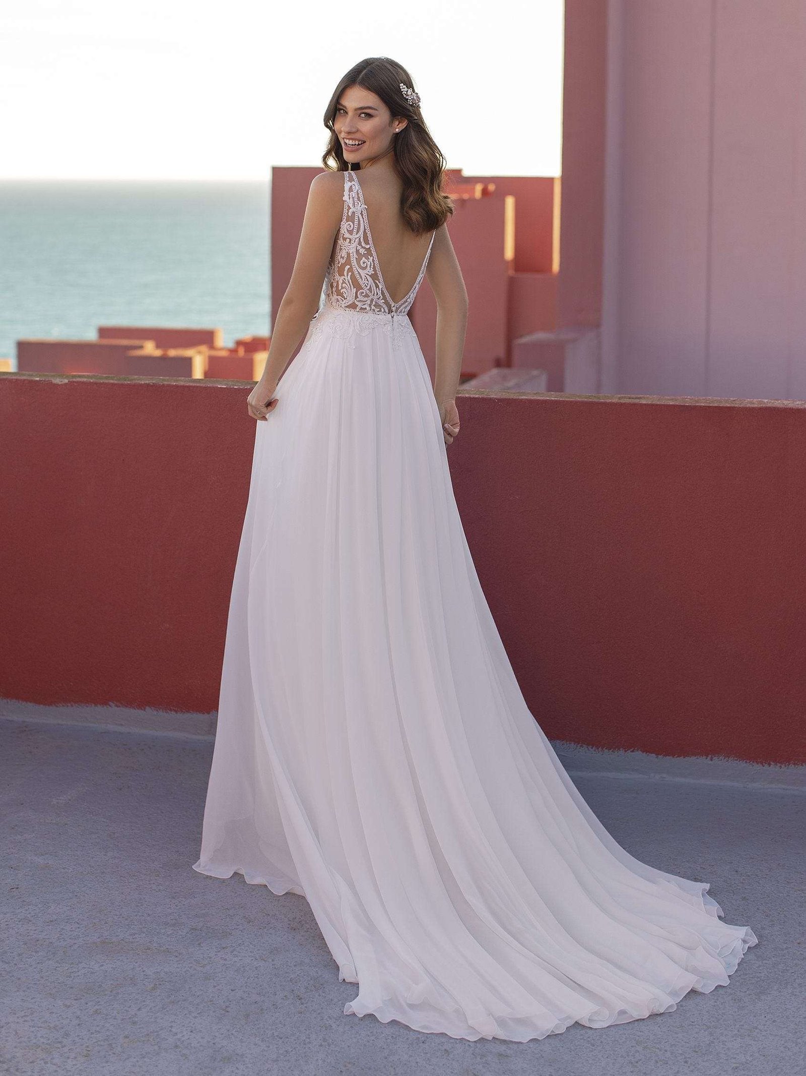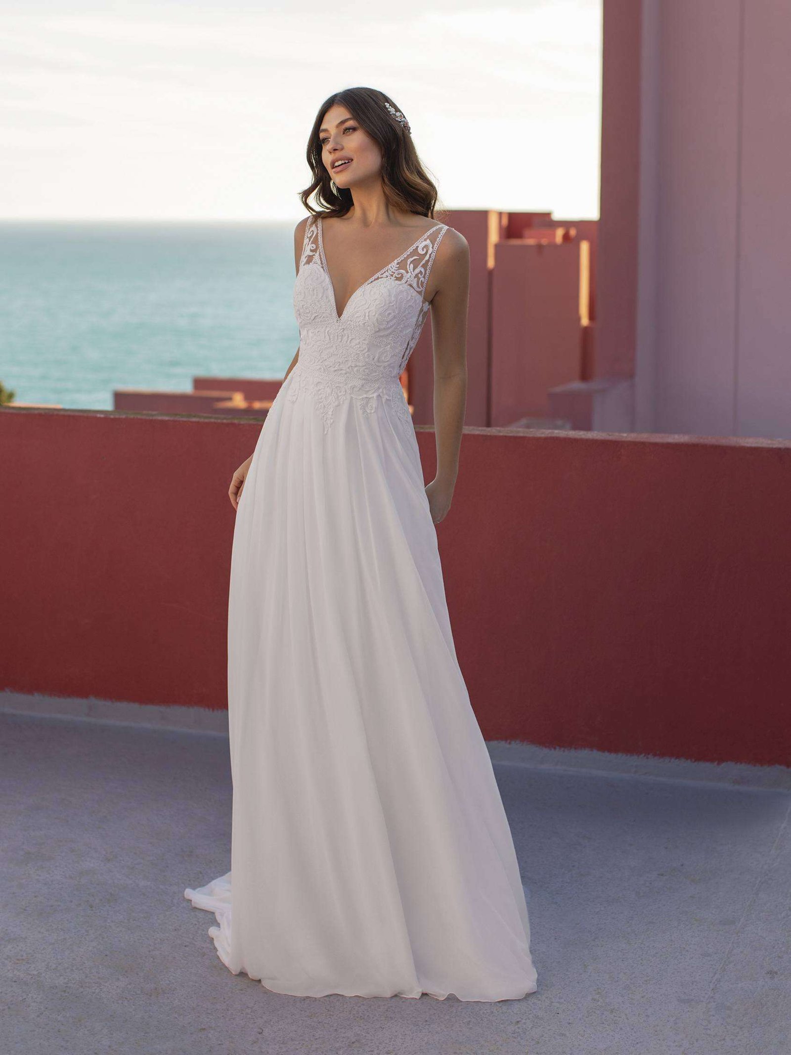 Descubre el encanto de este vestido de corte evasé confeccionado en encaje y suave y ondulante gasa. Luce un escote corazón muy favorecedor, una preciosa capa de encaje sobre el cuerpo y una vaporosa cola capilla.