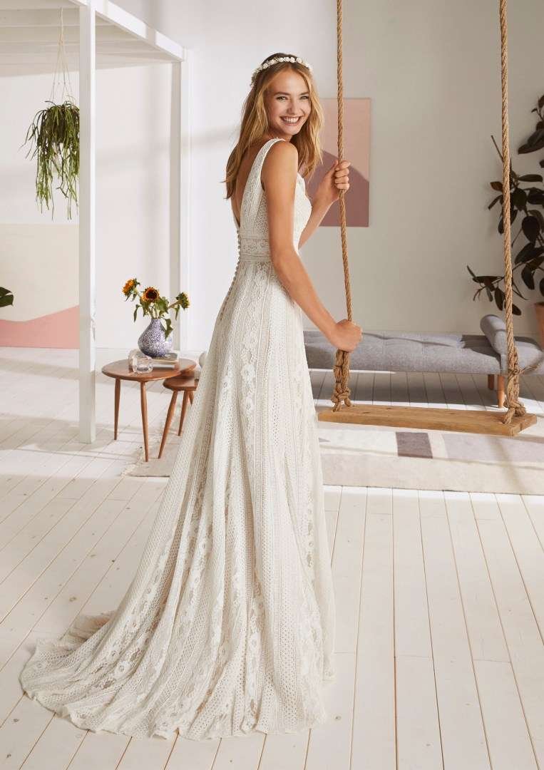 Descubre el encanto de este vestido de corte evasé confeccionado en encaje y suave y ondulante gasa. Luce un escote corazón muy favorecedor, una preciosa capa de encaje sobre el cuerpo y una vaporosa cola capilla.