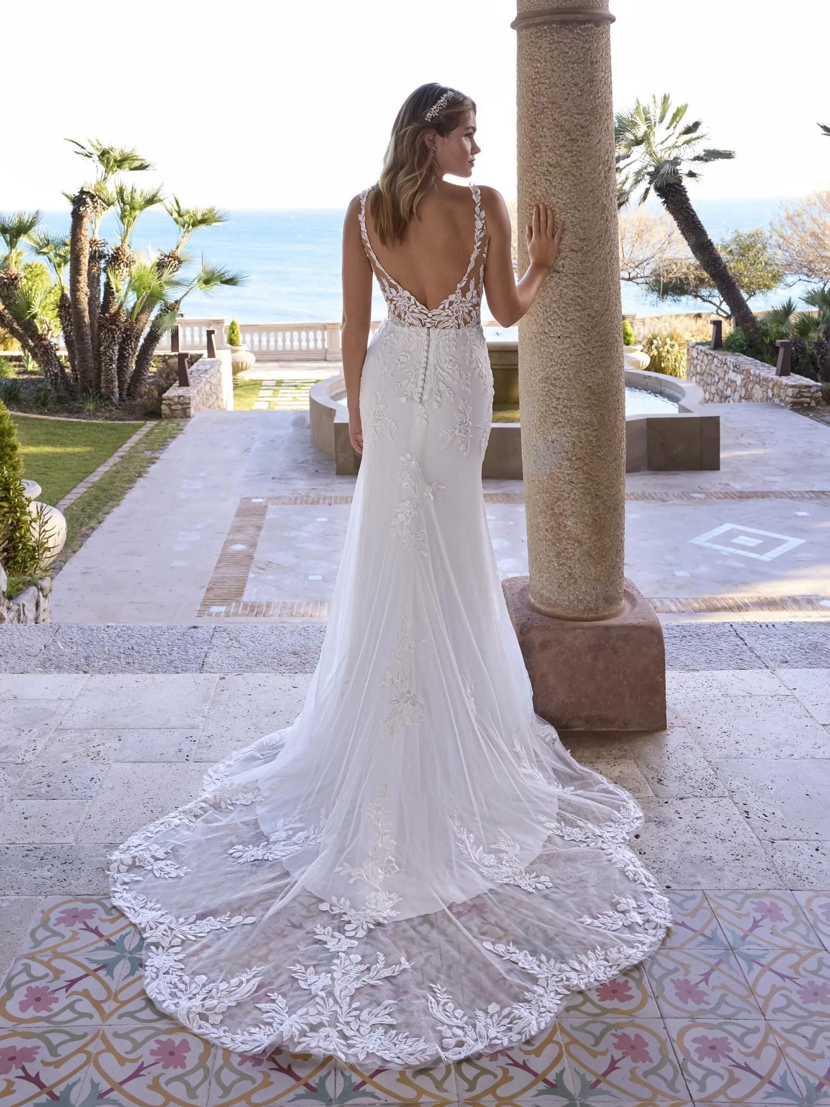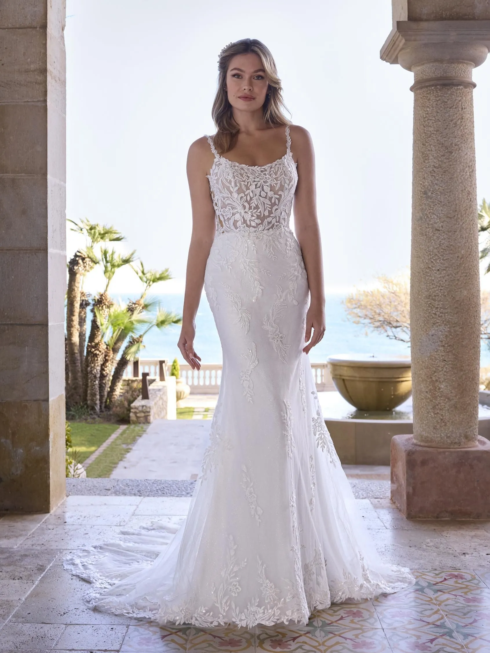 Irradia seguridad y estilo con este impactante vestido sirena, donde el escote cuadrado se equilibra con una atrevida espalda en V. La armonía entre tul, encaje, detalles brillantes y delicadas cuentas crea una estética dramática y sofisticada para la novia moderna.