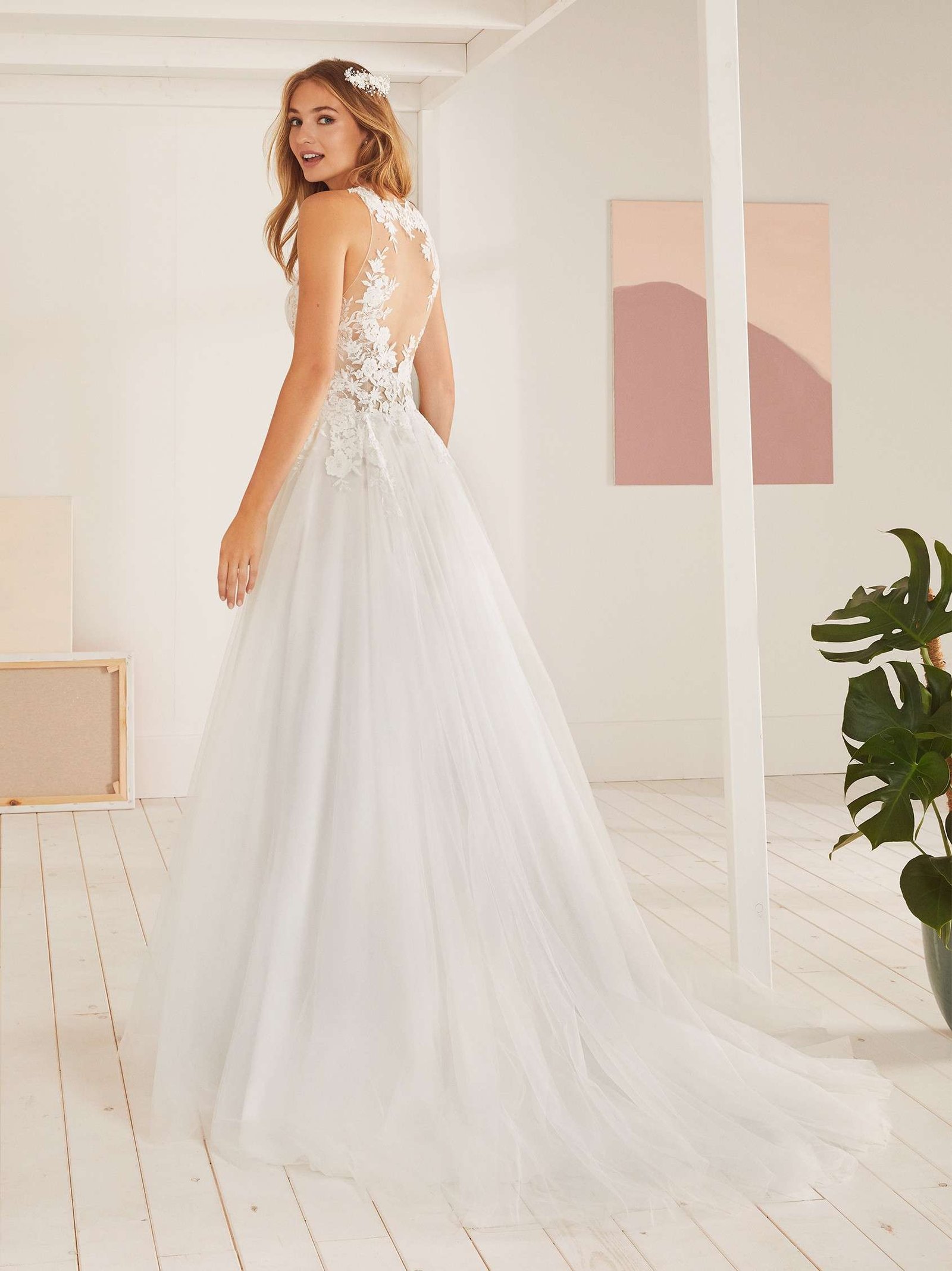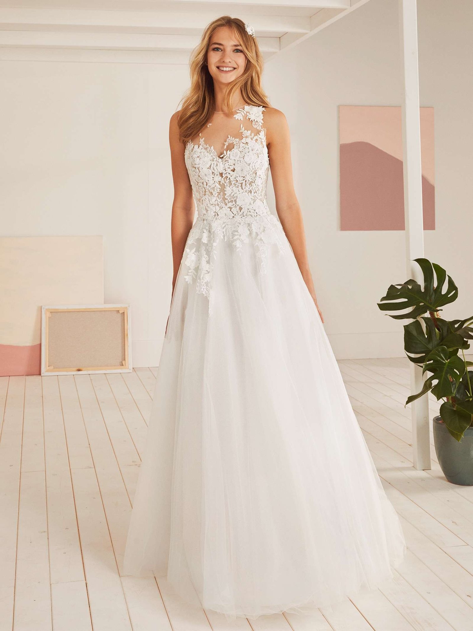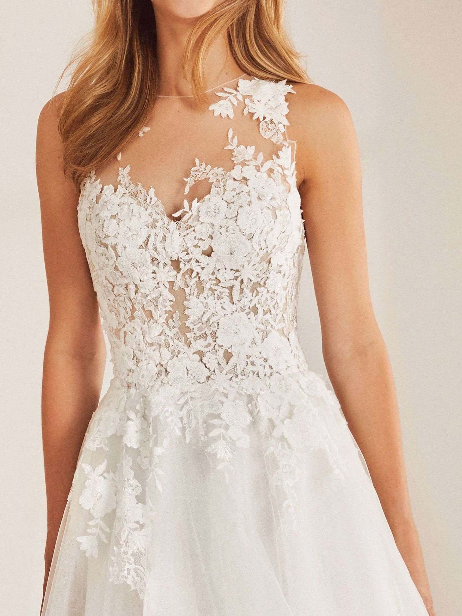 Romántico vestido de novia de efecto dos piezas. Un diseño que combina la elegancia del encaje con la sensualidad del tul cristal y los escotes fantasía: Falda princesa en tul y encaje; cuerpo de tul y encaje con aplicaciones bordadas en hilo; escotes ilusión en tul cristal bordado creando un efecto transparente muy sexy.